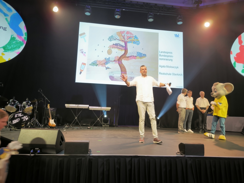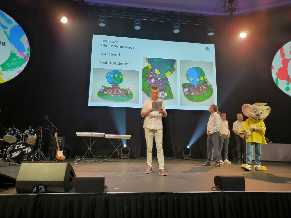 Moderator Knoll ruft die Landespreisträger auf. Im Hintergrund die plastische Arbeit von Lea Zepernick zum Thema" Europa - fantastisch gewachsen"