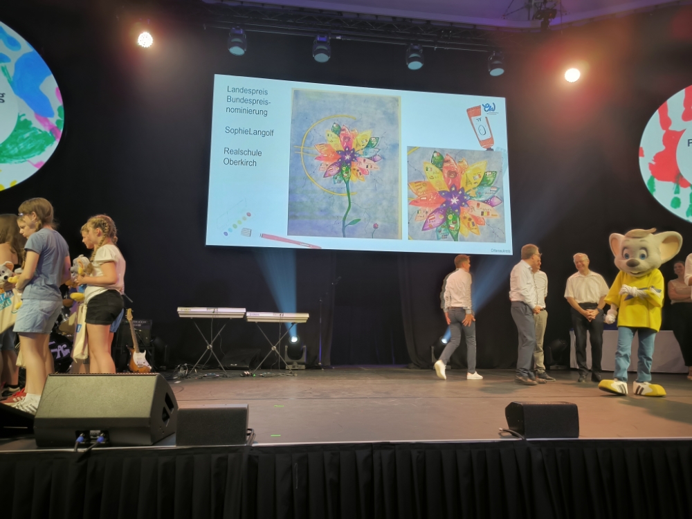 Alle Bundespreisträger mit Euromaus und dem Werk von Liah Boschert zum Thema "Schütze die Farben Europas"