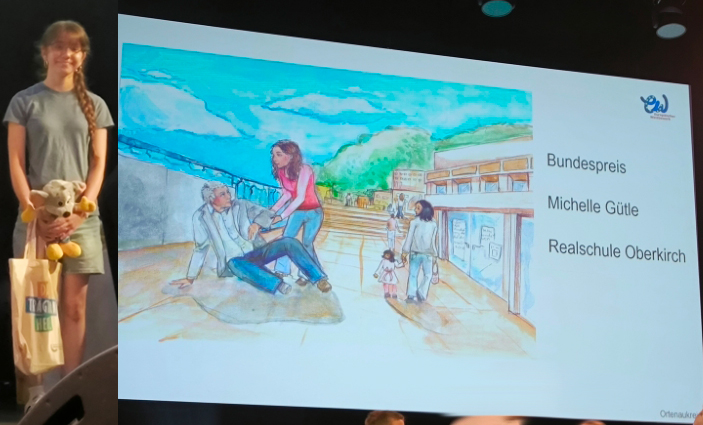 Bundespreisträgerin Michelle Gütle mit ihrem Werk zum Thema "Zusammen mutig sein" - Beispiele für Zivilcourage.