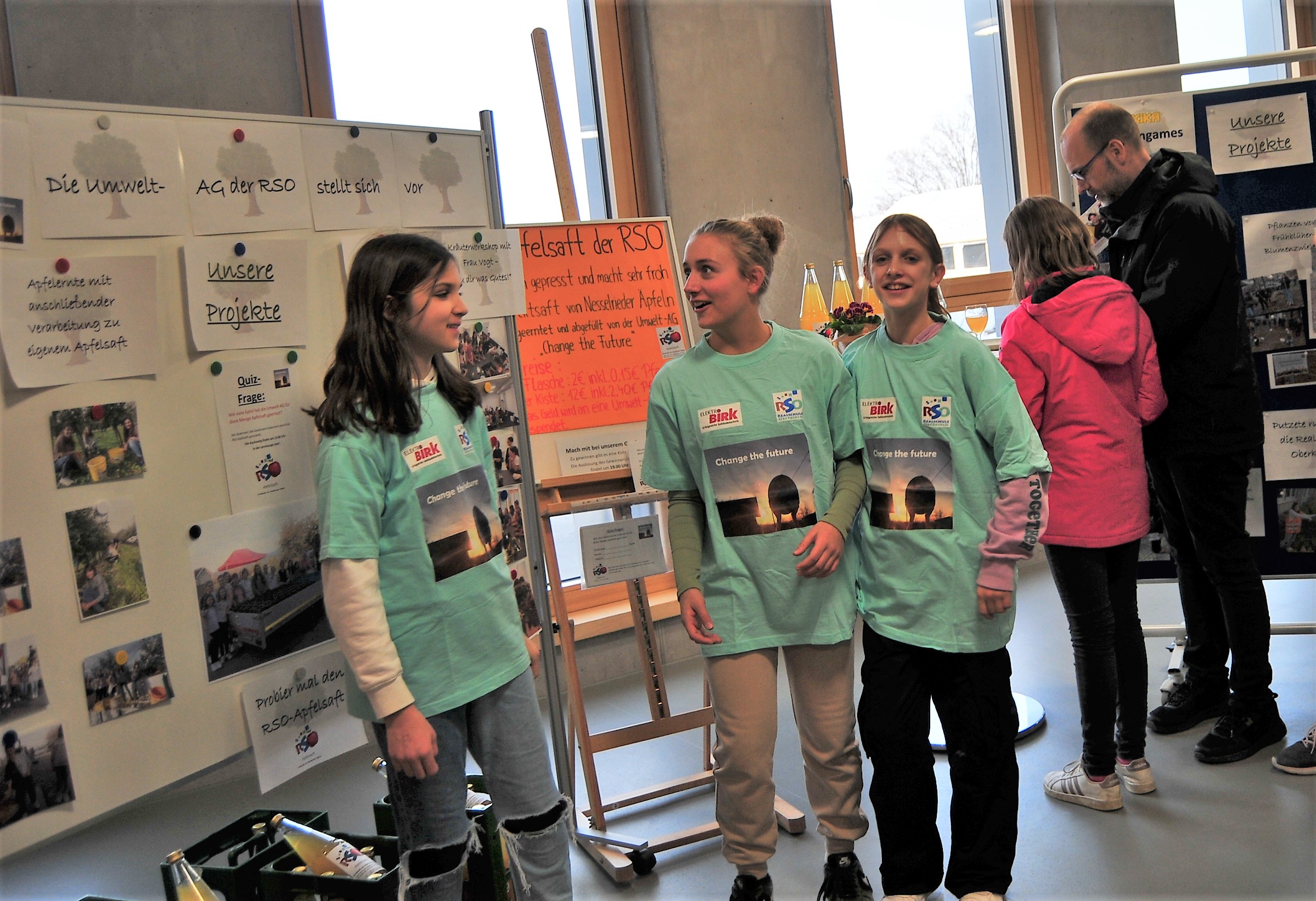 Die Umwelt-AG präsentiert stolz den selbst hergestellten Apfelsaft von Streuobstfrüchten