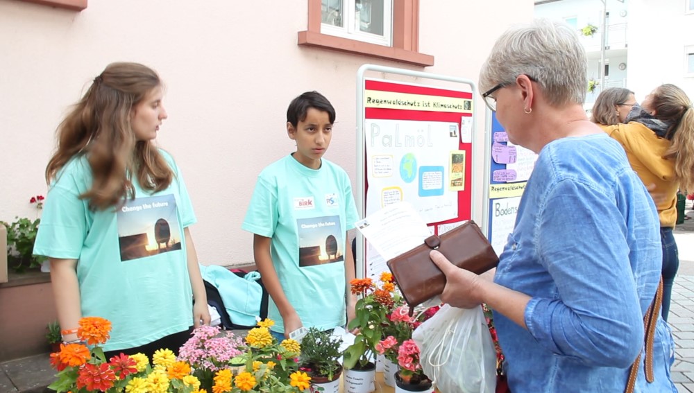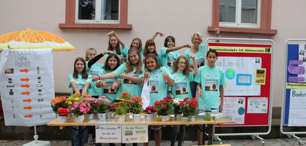 Die insgesamt 11 Schülerinnen und Schüler hatten mit ihrer Lehrerin Simone Kraus in den vorherigen Wochen fleißig Plakate erstellt und Infomaterial zu den Themen Palmöl, Soja und Fleisch, Holz und Papier usw. besorgt.