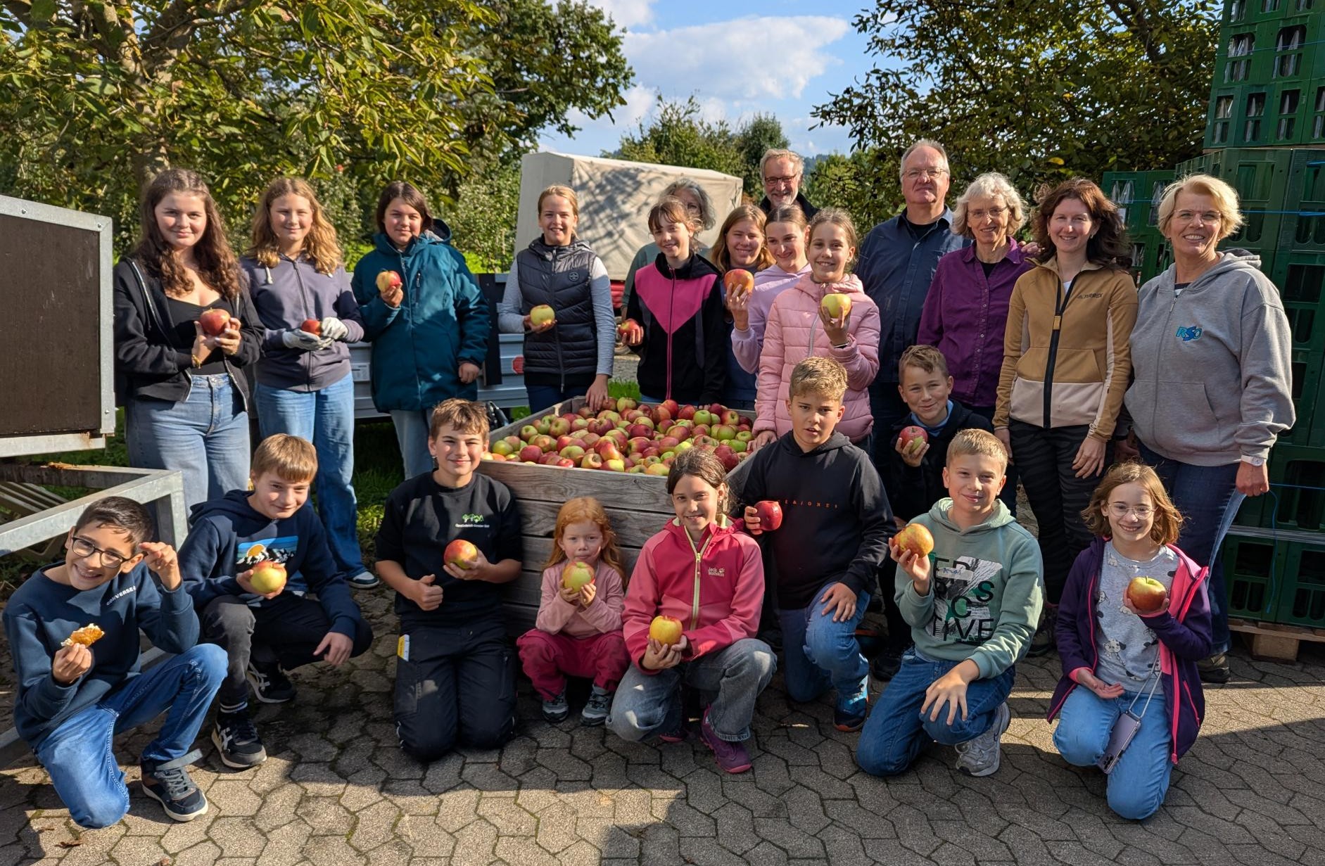 Es blieb kaum Zeit für eine Pause, denn schon kurz danach hatte man einen Termin beim Obsthof Kasper in Nußbach, um die Äpfel pressen zu lassen und als schmackhaften Direktsaft abzufüllen. Sage und schreibe 504 Flaschen Saft waren das Ergebnis dieses Arbeitseinsatzes.