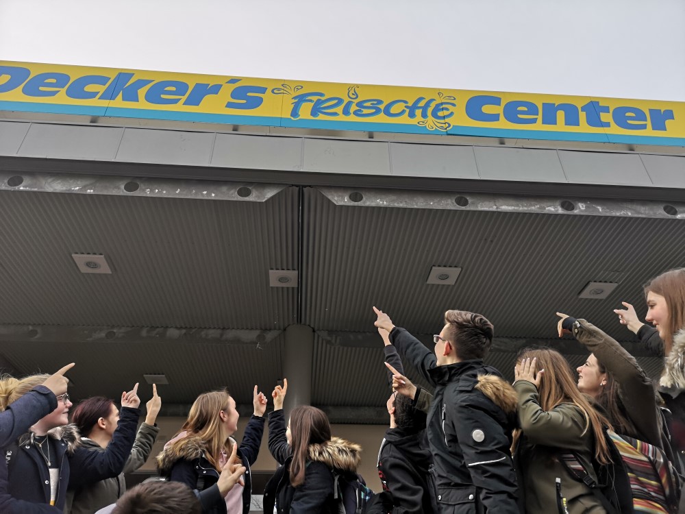 Gespannt vor Decker`s Frische Center. Herr Decker und sein Team erwarten die AES-Gruppe für einen Vortrag und einen Marktrundgang.