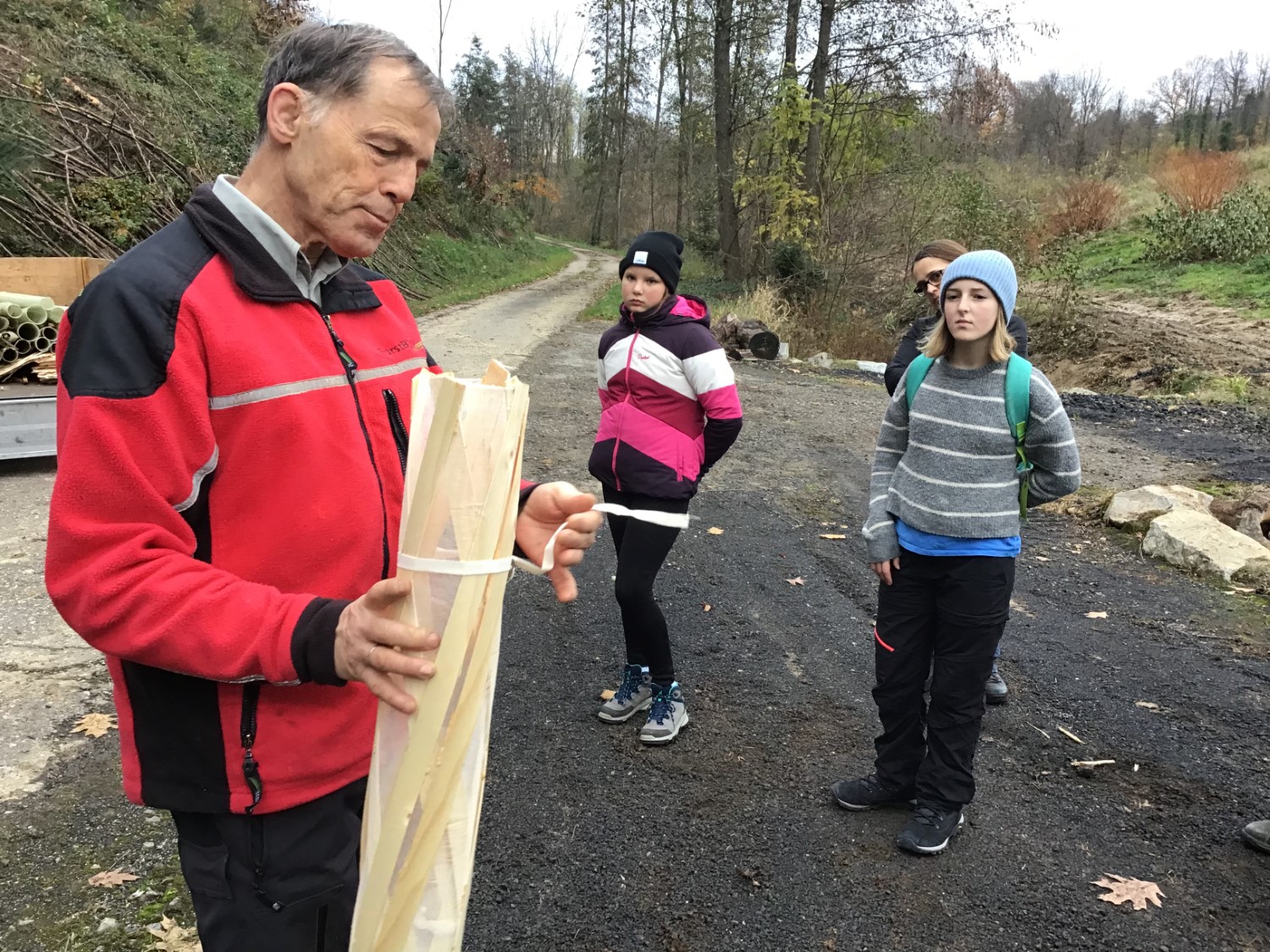 Förster Michael Sauter erklärt den biologisch abbaubaren Verbissschutz aus Holz und Baumwolle