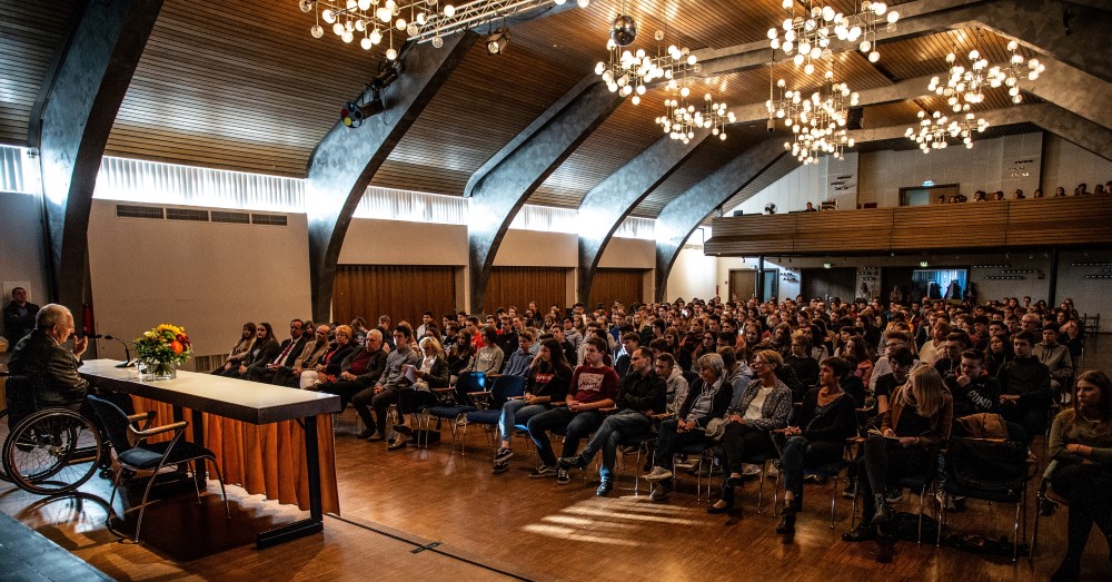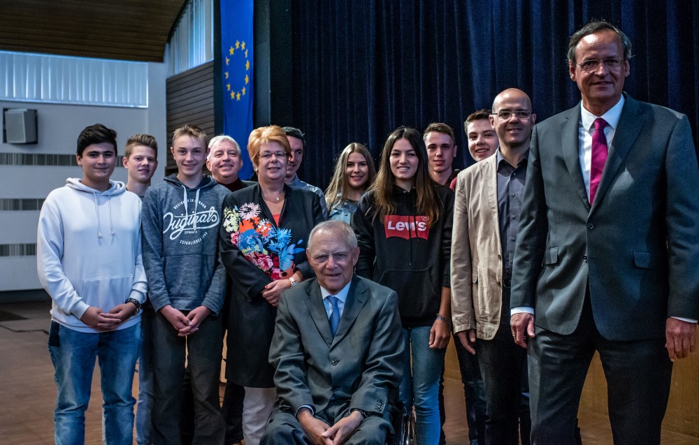 Aufgeräumt, interessiert, gelassen wirkt er, ab und zu ein aufblitzendes Lächeln, kurze Bemerkungen mit subtilem Witz und feiner Ironie, frei spricht er zu den Schülern, nimmt sie ernst und nimmt sie mit bei seinen Ausführungen, zunächst über die Bedeutung Europas und später bei ihren Fragen. Sein Appell geht zunächst an die Jugendlichen, sich zu beteiligen, politisch, sozial, in Vereinen, Institutionen. Politikverdrossenheit bzw. Desinteresse, auf die ihn Jugendliche ansprechen, heiße, anderen das Feld zu überlassen, heißt „andere entscheiden über euch“. In Großbritannien waren die jungen Menschen laut Umfragen überwiegend gegen den Brexit, hatten aber eine geringe Wahlbeteiligung: „ Um ihr Ziel zu erreichen, hätten sie sich stärker einmischen sollen.“ „Nichts ist im Leben so selbstverständlich, dass es nicht wieder genommen werden könnte“, Schäuble verwies darauf, „Dinge, die man hat, wert zu schätzen, ihr lebt in einer Gesellschaft, in der wir auf andere angewiesen sind und uns um andere kümmern sollten. Wir müssen darauf achten, dass die Menschen da, wo sie leben, sich zu Hause fühlen.“