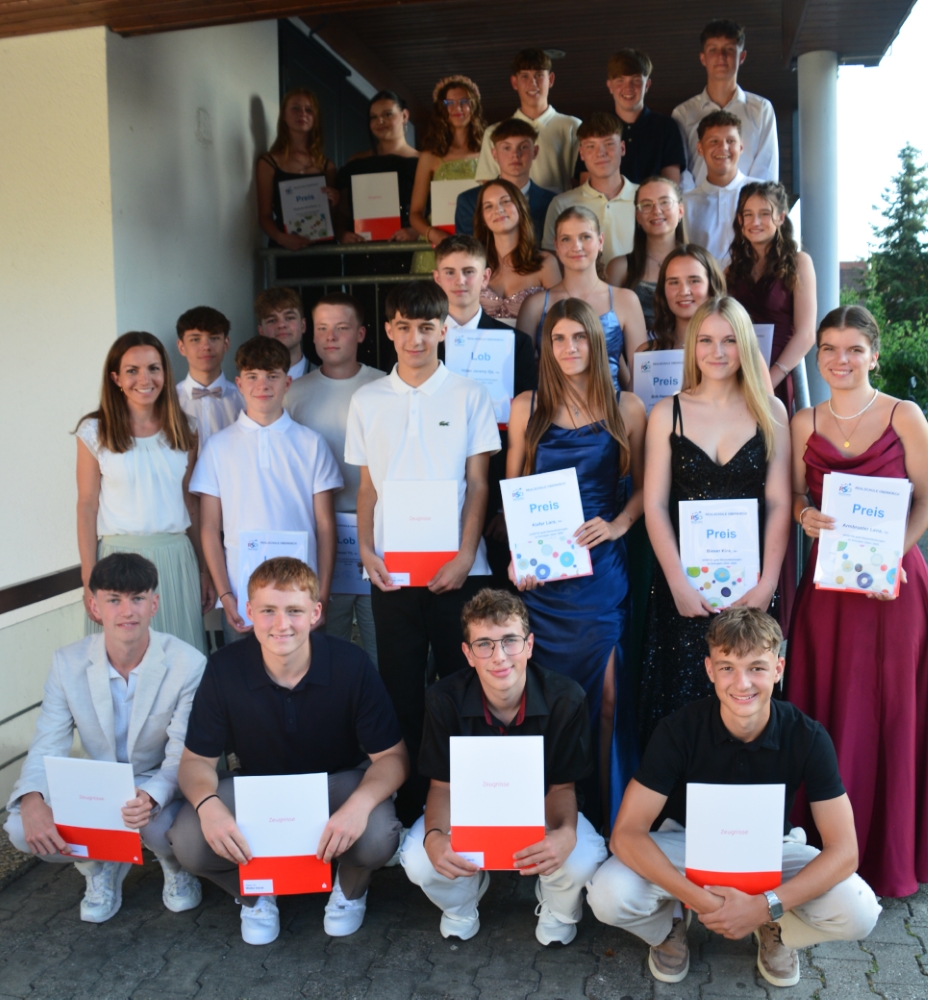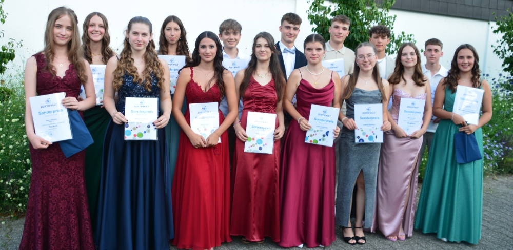 Deutsch: Sofia Müller und Lena Armbruster (1,4). Englisch: Michelle Birk (1,1). Fremdsprachen, gestiftet von der Sparkasse: Elias Groß (1,3). Mathematik, gestiftet von der Sparkasse: Timo Fraß und Elias Sholobow (1,0). Naturwissenschaften, gestiftet von der Firma Ernst: Hannah Birk und Loris Irsfeld (1,2). Technik, gestiftet von der Firma Ernst: Diana Kimele. AES: Alexandra Zerrer (1,1). Französisch: Patrick Müller (1,3). Sozialwissenschaften: Elias Groß (1,1). Geschichte: Emmy Mayer (1,0). Sport männlich: Patrick Müller (1,0). Sport weiblich: Olivia Ell (1,0). Kunst: Amelie Herdt (1,0). Musik: Angelina Bramser (1,0). Religion: Elias Sholobow (1,0).