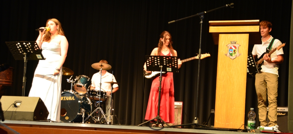 Musikalisch wurde die Feier von der eigens gegründeten Abschlussband unter Leitung von Musiklehrer Matthias Frietsch mit Titeln von Billie Eilish, The White Stripes und Yiruma grandios umrahmt. Darüber hinaus sorgten Angelina Bramser am Klavier und Vivien Urbaczka (Gesang) mit einer gefühlvollen Darbietung des Titels „What Was I Made For?“ für Gänsehaut-Momente. Der Abschluss bildete ein mitreißender Tanz der Abschlussschüler aus allen zehnten Klassen zu „Surprise“ unter Leitung von Stefanie Braun und Simone Kraus.