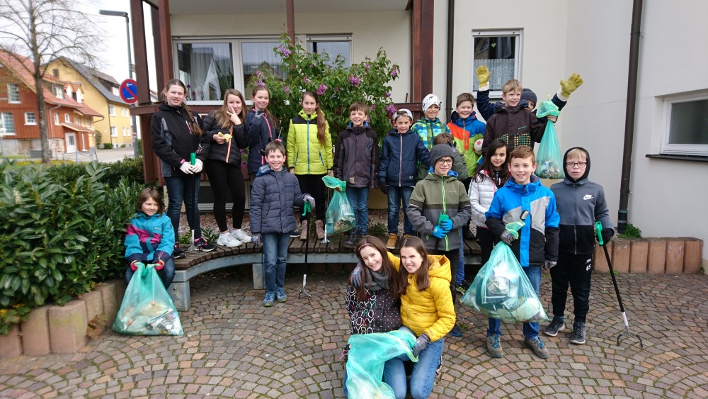 Die Klasse ist zufrieden mit ihrer Ausbeute nach dem Müllsammeln