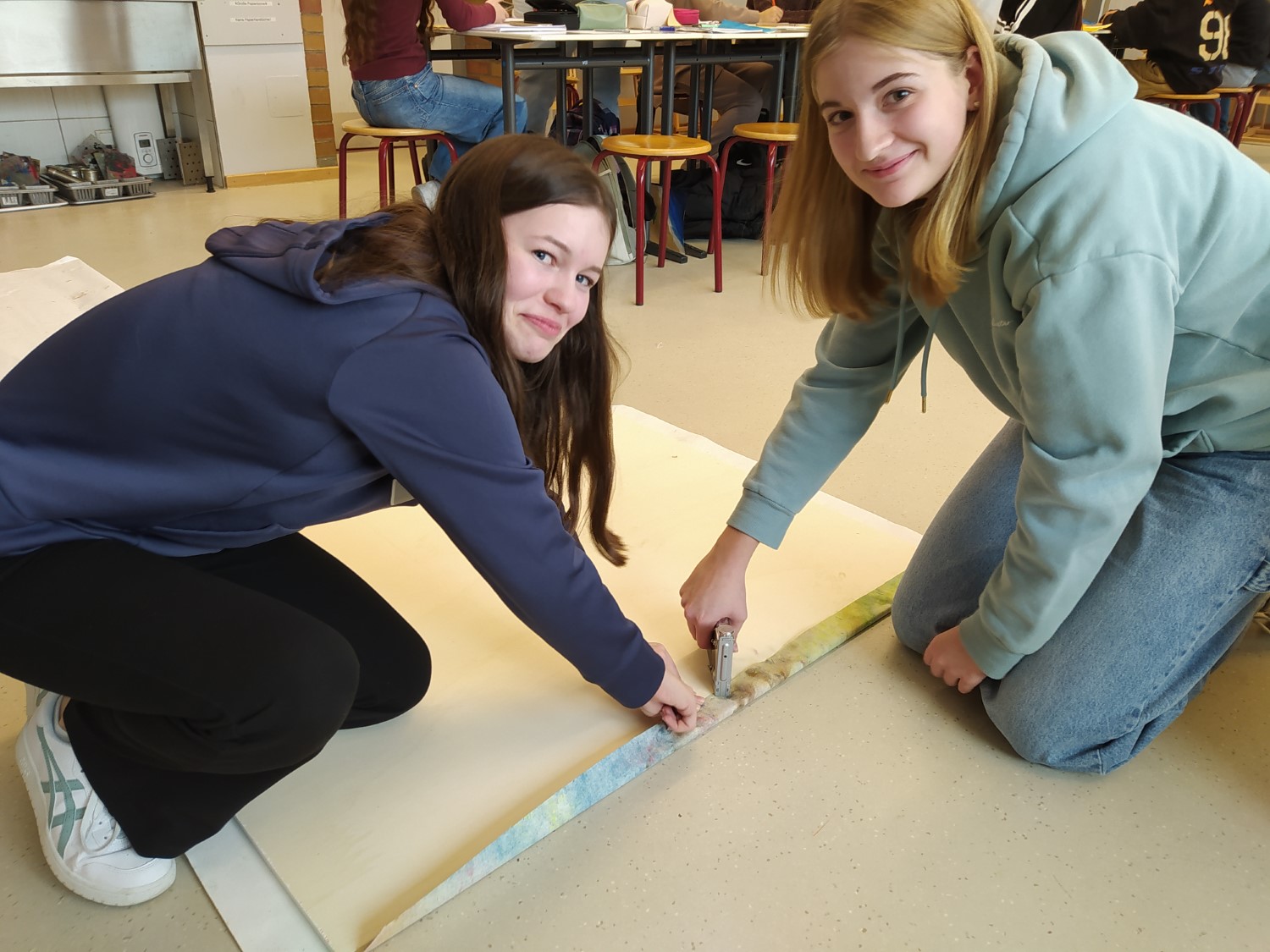 Anni und Emma tackern die Leinwand fest.