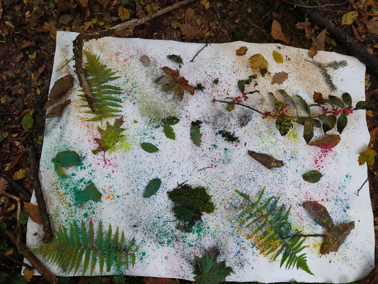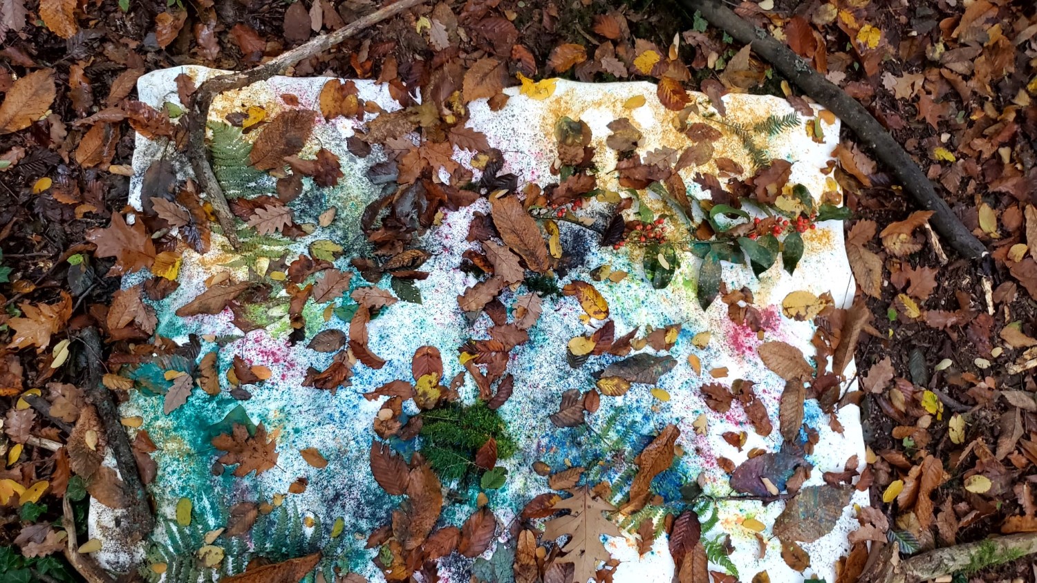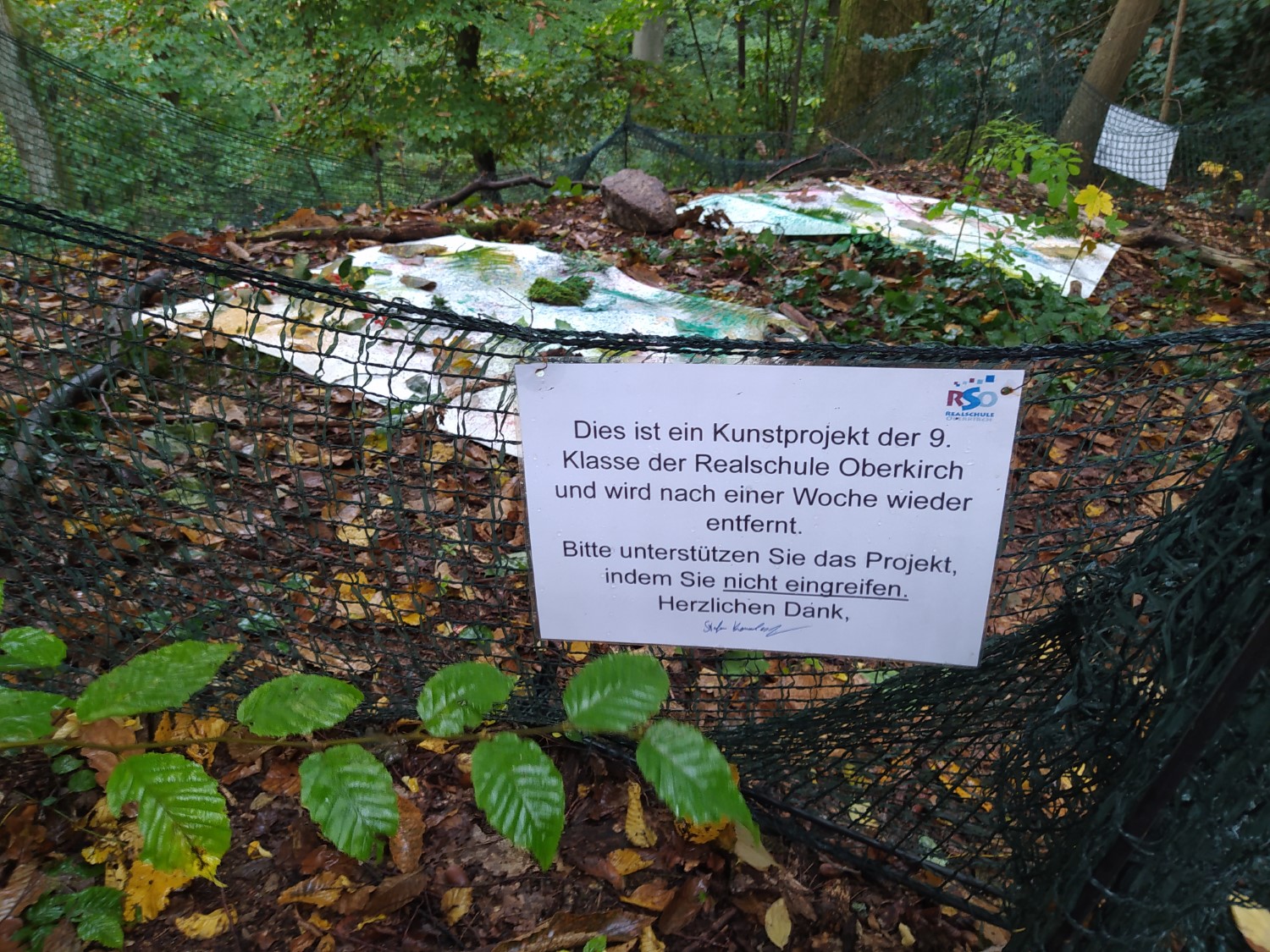 Inspiriert durch den Künstler Sam Falls, der den Wald Bilder gestalten lässt, machten sich die Klassen 9c und 9d mit ihrem Kunstlehrer Stefan Kowalsky selbst auf den Weg Leinwände im Wald auszulegen. Die Schülerinnen und Schüler ordneten darauf Zweige, Blätter und Pflanzenteile an, "bestäubten" anschließend das Arragement mit Farbpigmenten und ließen die Natur das Übrige tun. Eine Woche lang arbeiteten Wind, Regen, Sonne und Waldtiere weiter an den Bildern.