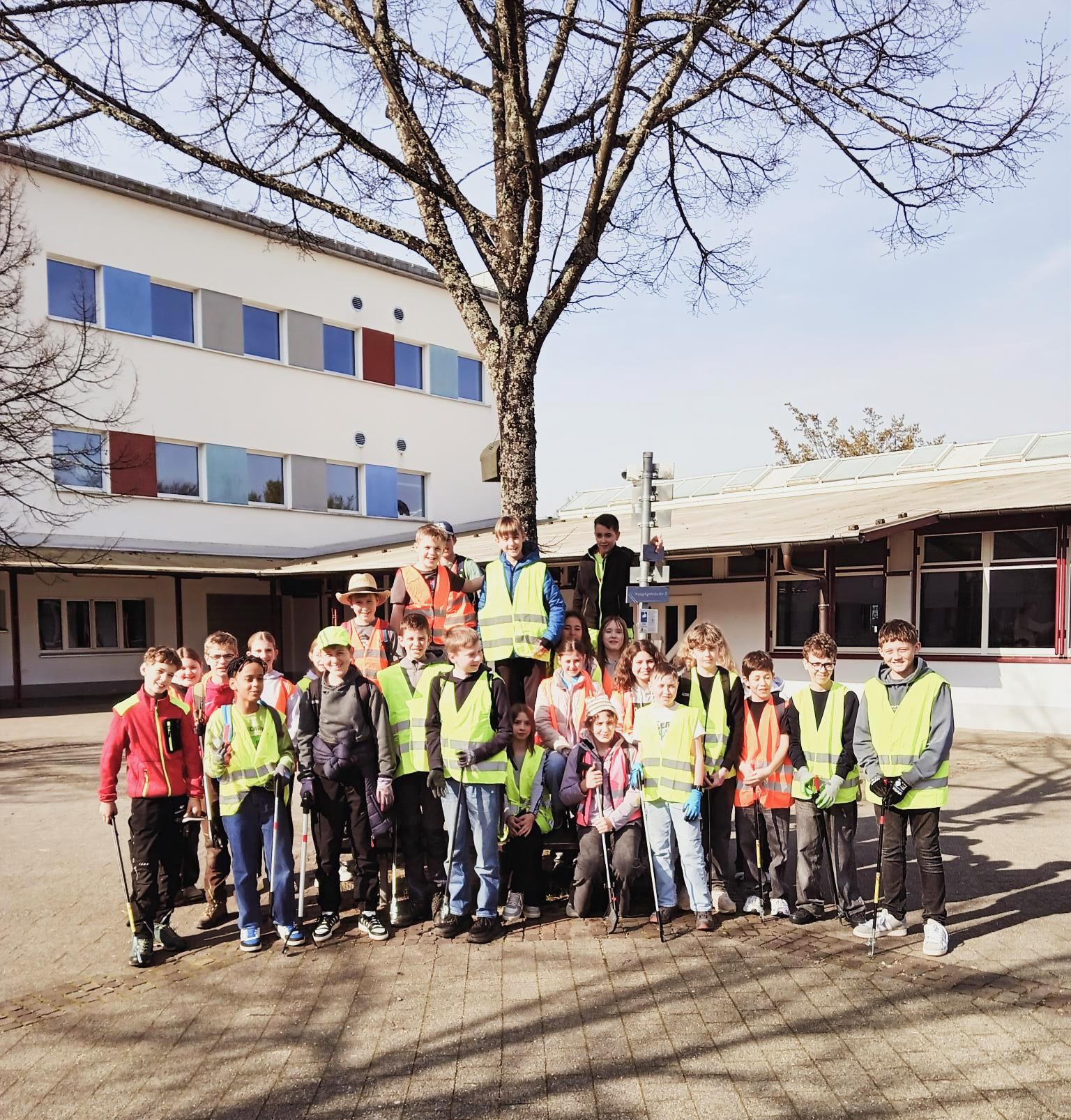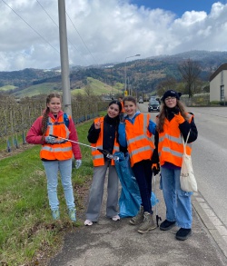 Bei strahlendem Frühlingswetter zog die Klasse 6b der Realschule am Dienstagmorgen zur diesjährigen Kreisputzete los. Ausgestattet mit Bollerwagen, Müllzangen, Handschuhen und Warnwesten machte sich die rund 30-köpfige Gruppe auf den Weg von der Schule hinauf zur Burg Schauenburg. Die Schülerinnen und Schüler sammelten mit großem Eifer Papierfetzen, Dosen, Verpackungen und sogar einige größere Fundstücke ein.