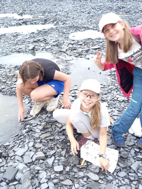 Mia, Lia-Mai und Emma (5f) auf der Suche nach Fossilien im Schieferbruch Kromer