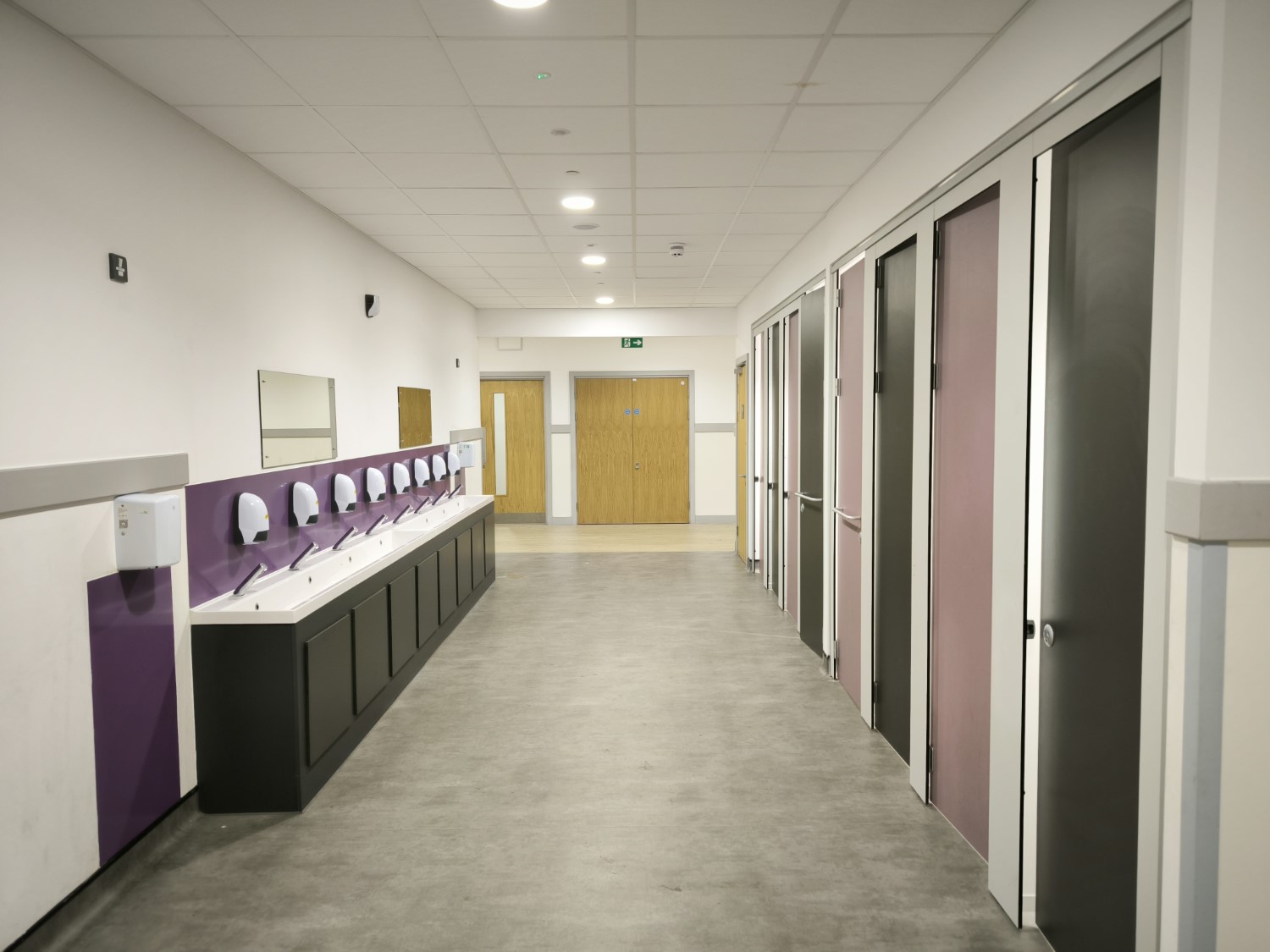 Unisex- Toilettenräume kommen ohne Türen zu den Fluren aus. Alle anderen Aufenthalts- und Lernbereiche sind mit Aufsichtspersonal ausgestattet.