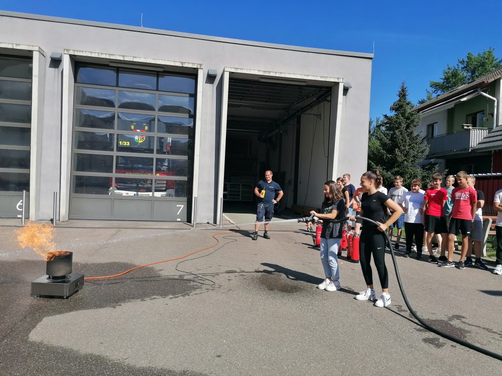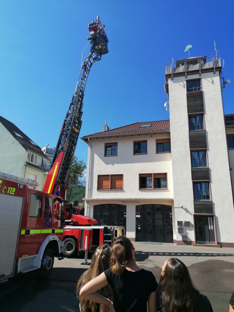 Nach dem im Chemieunterricht das Thema Brandbedingungen theoretisch und zum Leidwesen des Geruchssinns auch praktisch durchgenommen wurde, durfte die 7e bei der Feuerwehr in Oberkirch zuerst mit einem Feuerlöscher und dann mit dem großen Löschwagen ein künstlich gelegtes Feuer löschen. Zum Abschluss durfte jeder Schüler mit der Drehleiter Oberkirch aus einer Höhe von 30m bewundern.