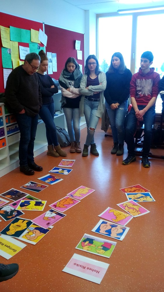 In einer Übung mussten die Schüler verschiedene Situationen nach ihrem Ansteckungsrisiko bewerten und Bilder richtig zuordnen.