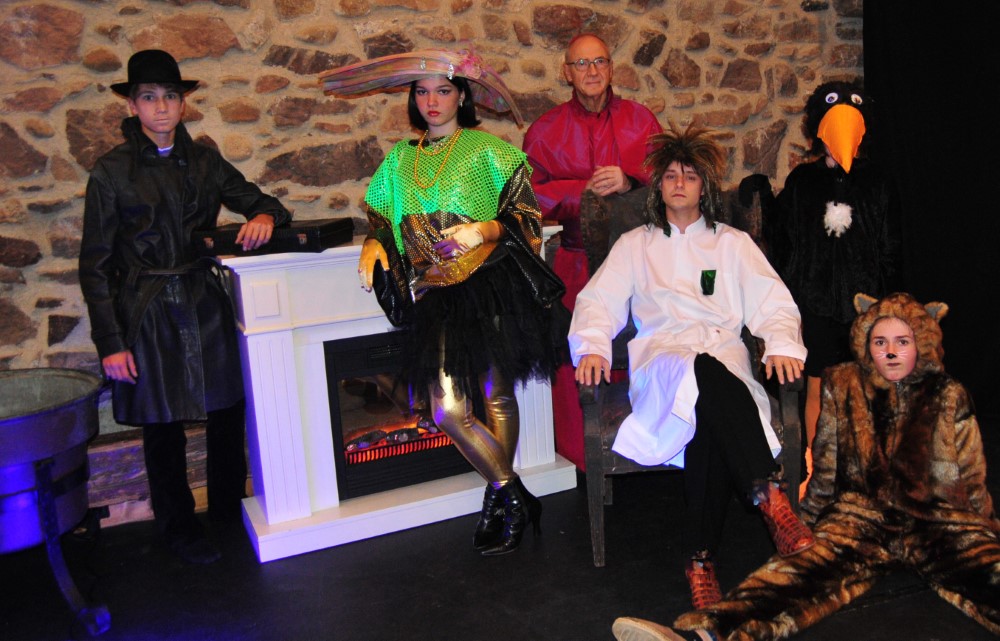 (v.re) Kater Maurizio (Maria Frassica) und Rabe Jakob (Jakob Ganter) wollen die Welt retten, die Prof. Irrwitzer (Robin Jekal, 3.v.re) und Tyrannja Vamperl (Chiara Lazellotti, 5.v.re), mit Gerichtsvollzieher Made (Moritz Steger, li) auf ihrer Spur, zugrunde richten wollen, der Heilige Sylvester (Arthur Hilberer, 3.v.li) leistet den beiden Hilfe.