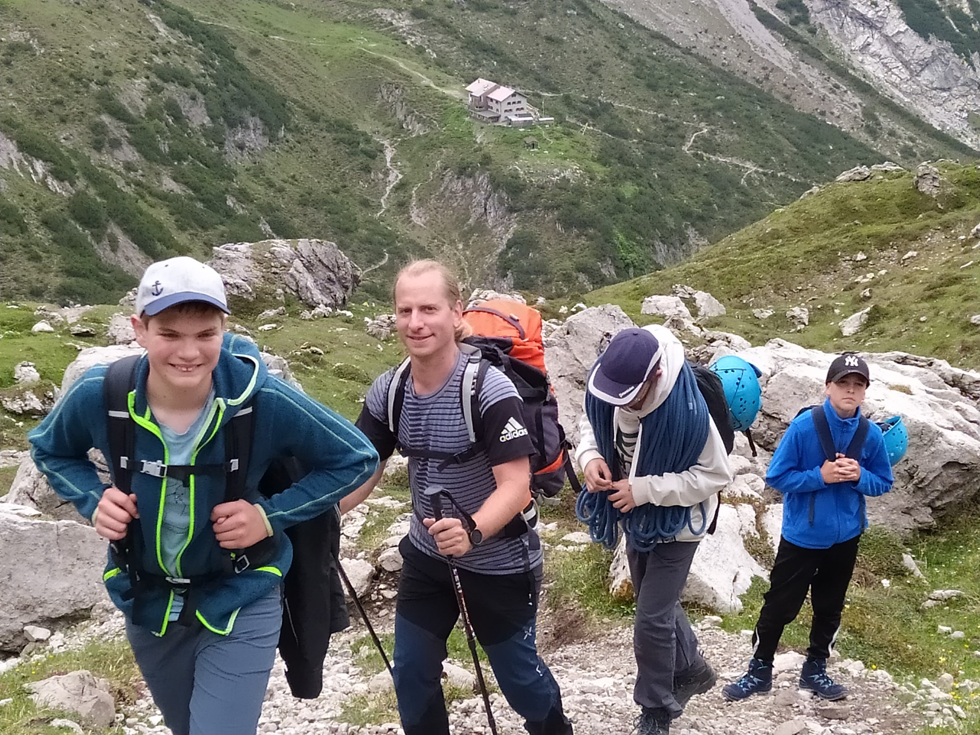 Früh morgens starteten fünfzehn junge Bergsteigerinnen und Bergsteiger mit ihren drei Betreuern in Richtung Österreich. Nach einer mehrstündigen Autofahrt und der Überquerung des Arlbergpasses erreichte die Gruppe gegen Mittag die Alfuzalpe (1280m) oberhalb von Zams. Von nun an ging es zu Fuß und mit vollbepacktem Rucksack entlang eines Gebirgsbachs bis zur Weggabelung Hinterstark (1621m). An dieser Gabelung führte der Weg in vielen Serpentinen steil hinauf auf die Steinseehütte (2069m). Die Gruppe wurde von den Hüttenwirtsleuten Manuela und Christoph herzlich empfangen. Von der Terrasse der Hütte aus genossen alle völlig erschöpft, aber überglücklich den Aufstieg geschafft zu haben, das Alpenpanorama.