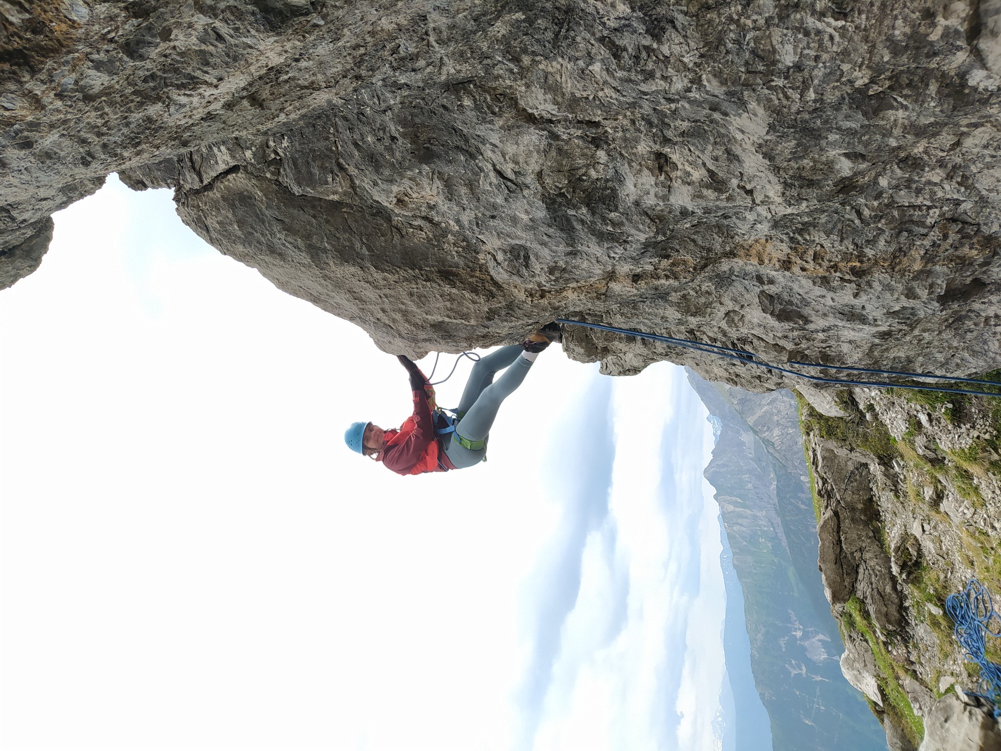 In der Nacht zum Mittwoch zog eine Kaltfront über die Lechtaler Alpen. Aus diesem Grund hatte es in der Nacht und auch am Morgen geregnet. Nach Rücksprache mit dem Bergführer beschloss man bis kurz vor Mittag zu warten, um dann nochmals in den Klettergarten aufzusteigen. Da sich das Wetter kaum verändert hatte und der Fels auch sehr nass und rutschig war, wurden die Seilkommandos (Stand – Seil ein – Seil aus – Nachkommen) eingeübt. In der Horizontalen arbeiteten sich alle Seilschaften von einem Haken zum anderen. Diese Vorbereitung sollte sich am nächsten Tag entsprechend ausbezahlen.