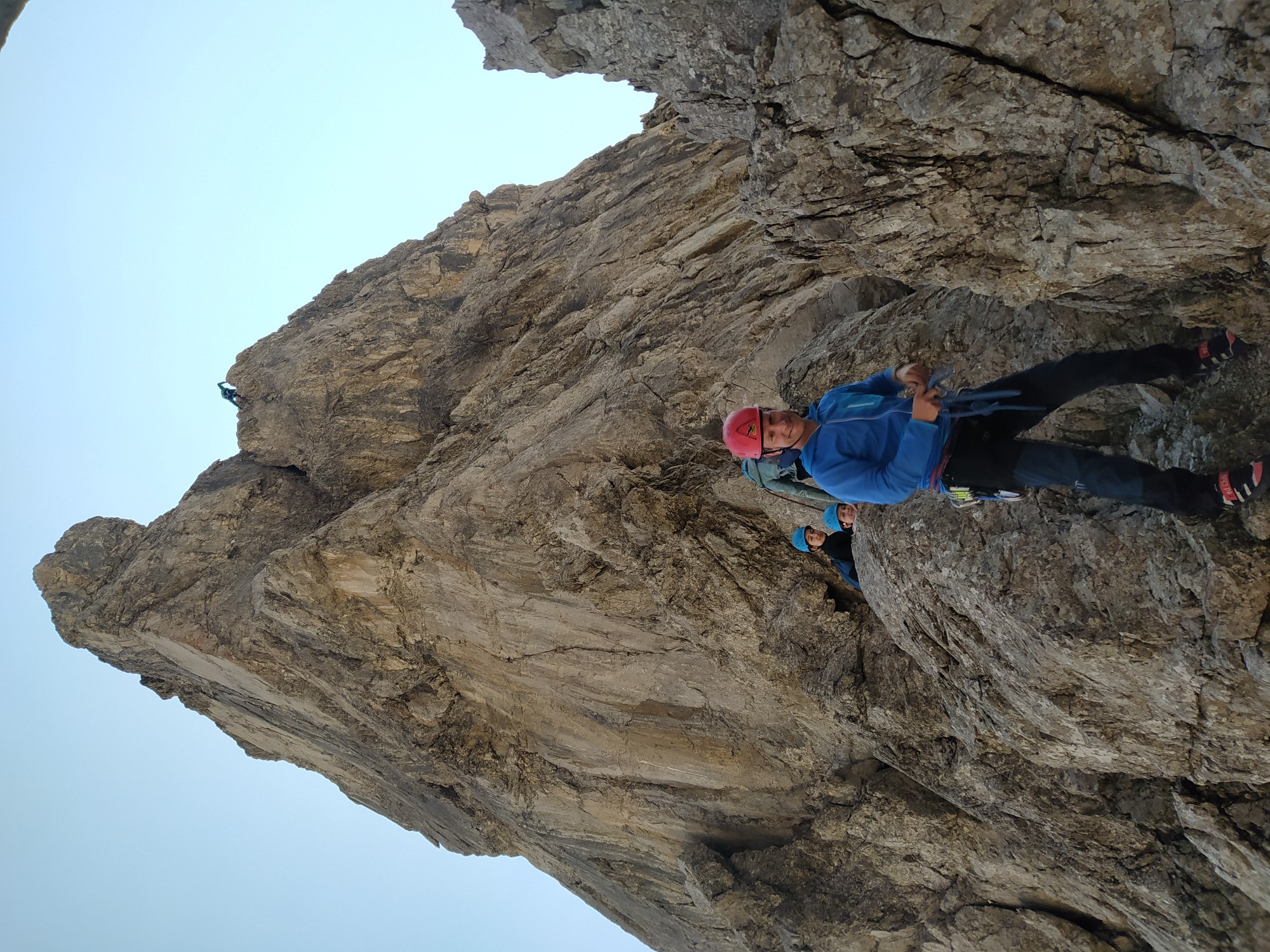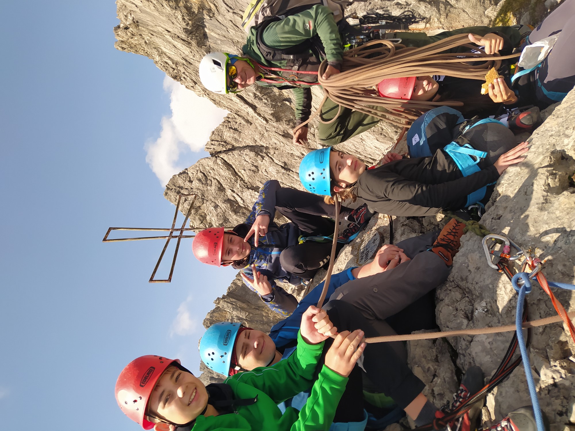 Am Donnerstag war Gipfeltag und nun ging es in die Vertikale. Es waren perfekte Wetterbedingungen, trocken und Sonne. Da fünfzehn Kletterer in einer alpinen Route ein erhöhtes Risiko darstellen, wurde die Gruppe geteilt. Die erste Gruppe machte sich mit dem Bergführer Willi und zwei Betreuern auf den Weg. Nach dem Aufstieg erreichte man den Einstieg des Spiehlerturms. Mit vier Seilschaften starteten die Gipfelstürmer in die Tour. Sieben Seillängen mussten absolviert werden, wobei die Schlüsselstelle einen Schwierigkeitsgrad von IV- aufweist.