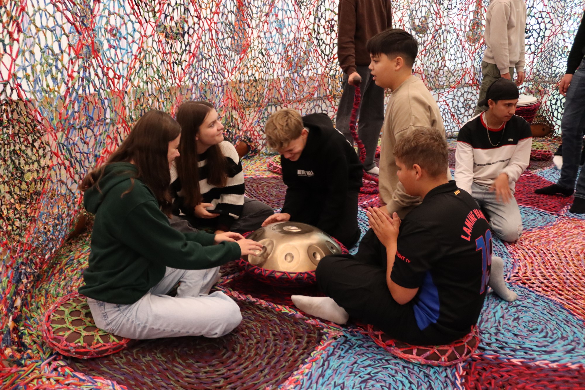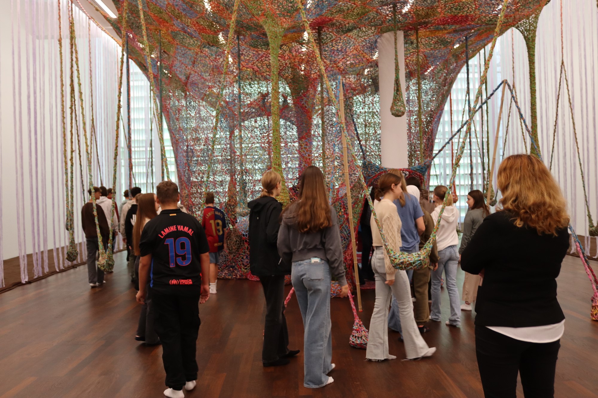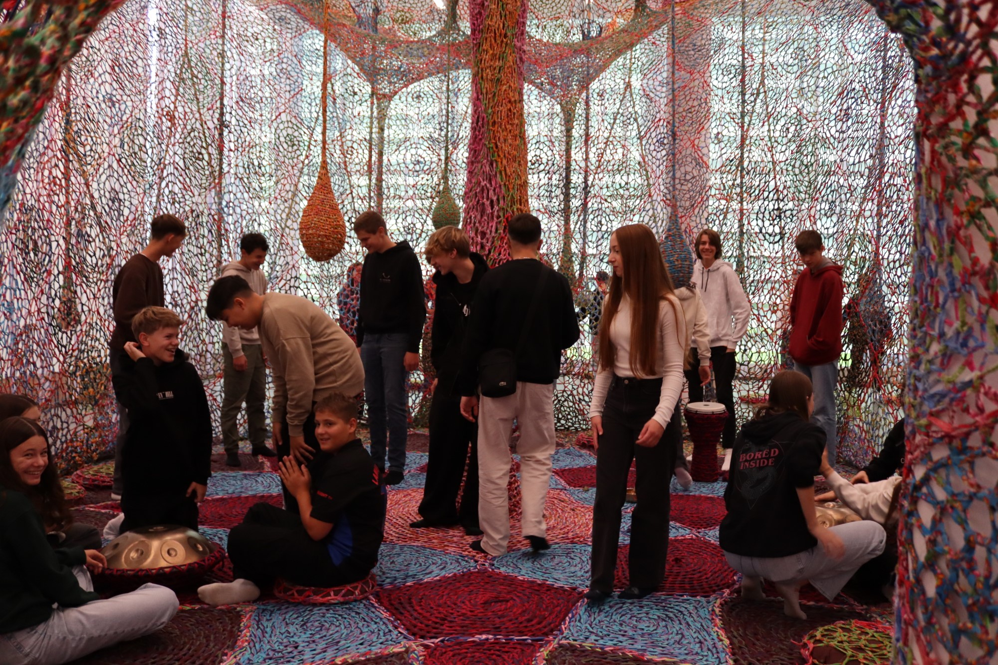 Dass Kunst so ganz anders sein kann, als wir uns das manchmal so vorstellen, erlebten die Schülerinnen und Schüler interaktiv beim raumgreifenden Werk von Ernesto Neto "earth-tree-life-love". Eine riesige Baumwollhäkelarbeit spinnt sich durch den Raum, die Steine, Pflanzen, Musikinstrumente und Betrachter "umgarnt". So wird der Betrachter spielend selbst zum Kunstwerk, welches eine ursprüngliche Verbindung zur Natur spürbar macht.