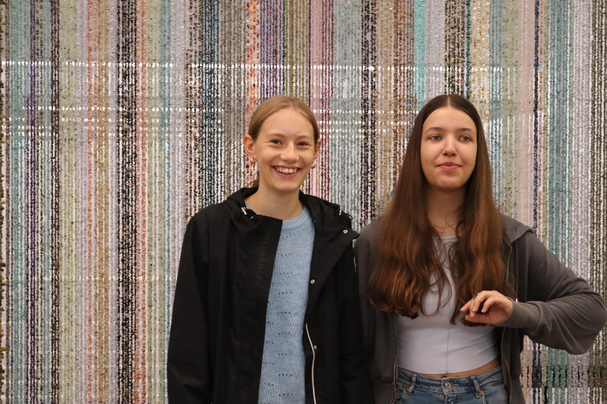 Barbara und Marlene vor einem Vorhang aus tausenden von aufgefädelten Heilsteinen.