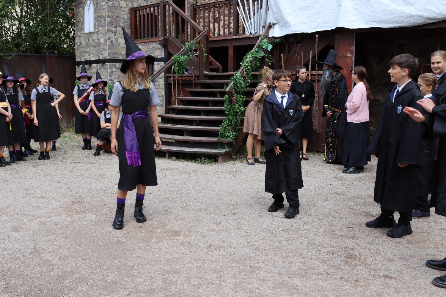 Sie proben eifrig für die bevorstehende Premiere des Theaterstücks „Eine lausige Hexe“: im Vordergrund Mildreds Widersacherin Esther Edel (Larissa Rindler), rechts im Bild Zauberschüler auf Stippvisite, dahinter Lehrkräfte im Gespräch.
