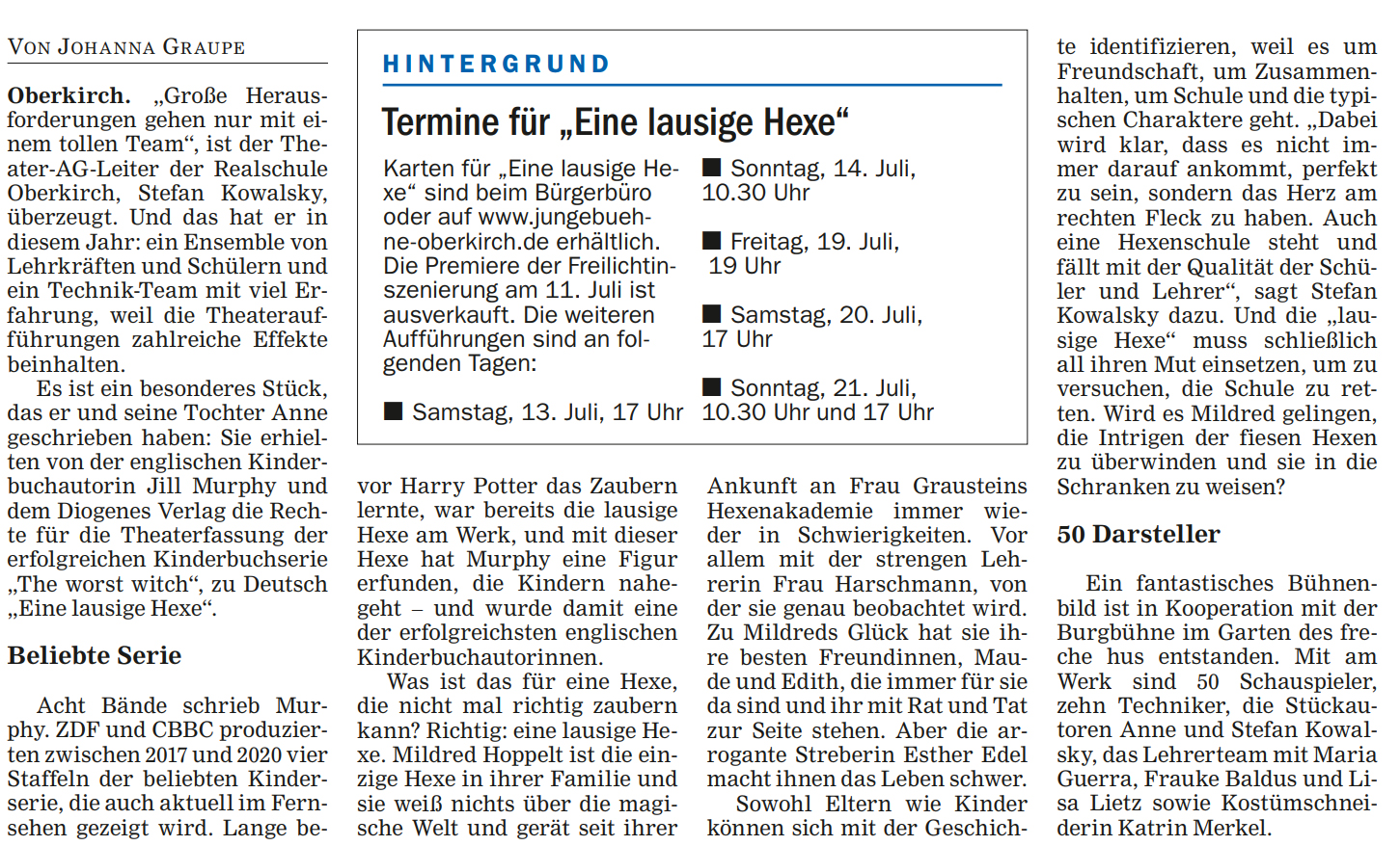 In Oberkirch wird die erfolgreiche Serie „Eine lausige Hexe“ für das Theater adaptiert. Die Premiere des Stücks, das sich um Schule, Freundschaft und Zusammenhalt dreht, ist bereits ausverkauft.
