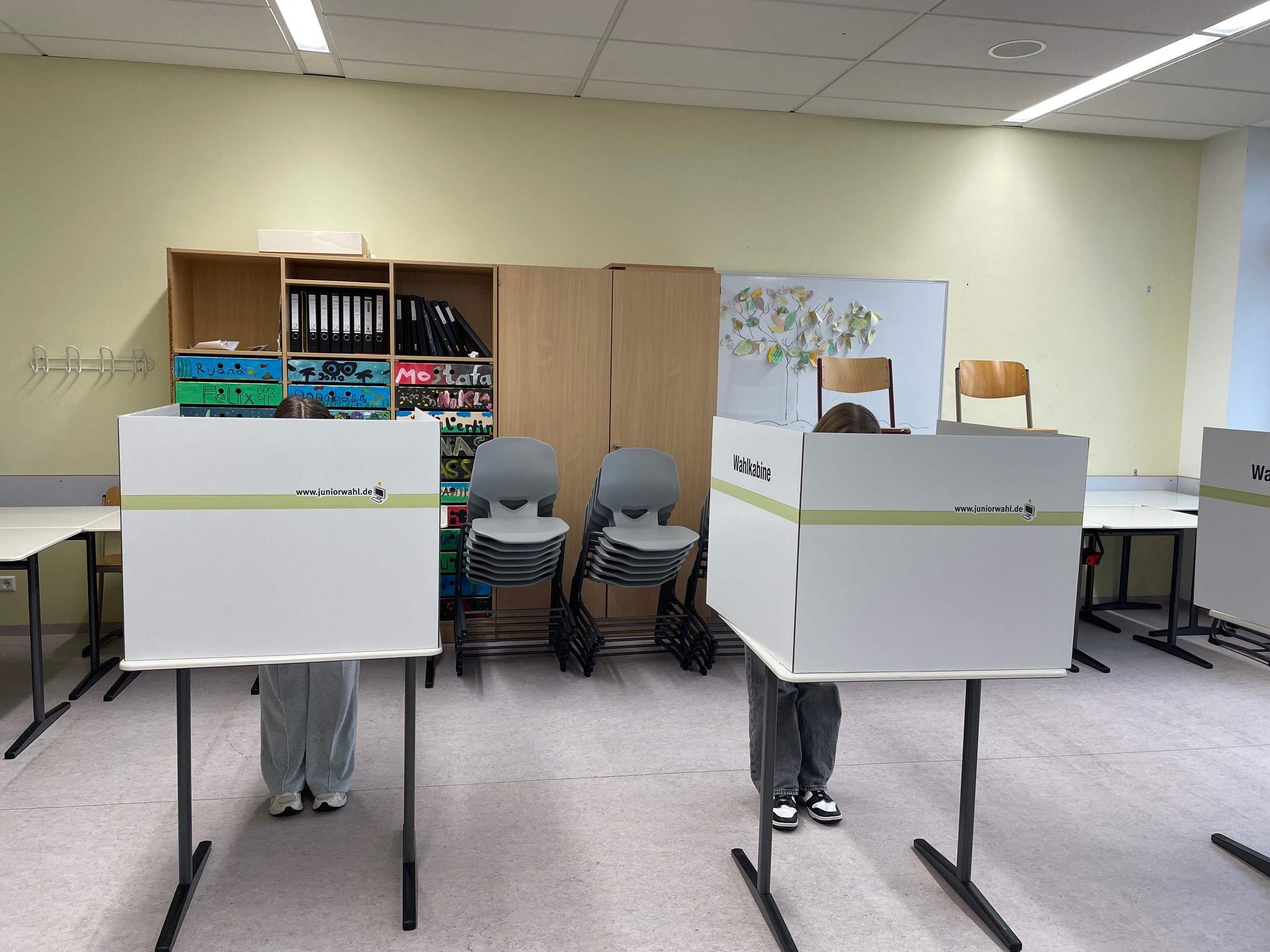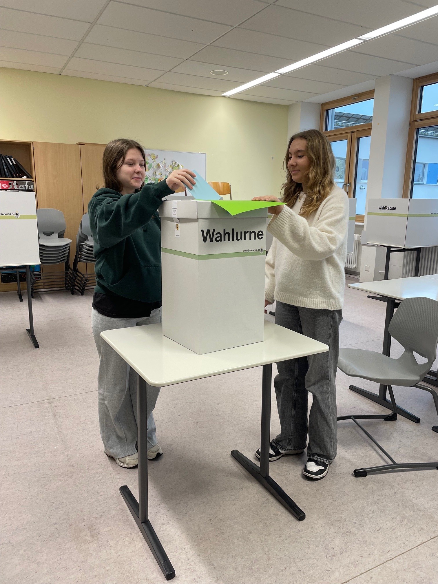Organisiert wurde die Juniorwahl von Frau Karl und Frau Stehle. Unterstützung erhielten sie von engagierten Wahlhelferinnen und Wahlhelfern aus den Klassen 8c und 8f, die bei der Vorbereitung und Durchführung der Wahl halfen und so einen wichtigen Beitrag zum Gelingen der Aktion leisteten.