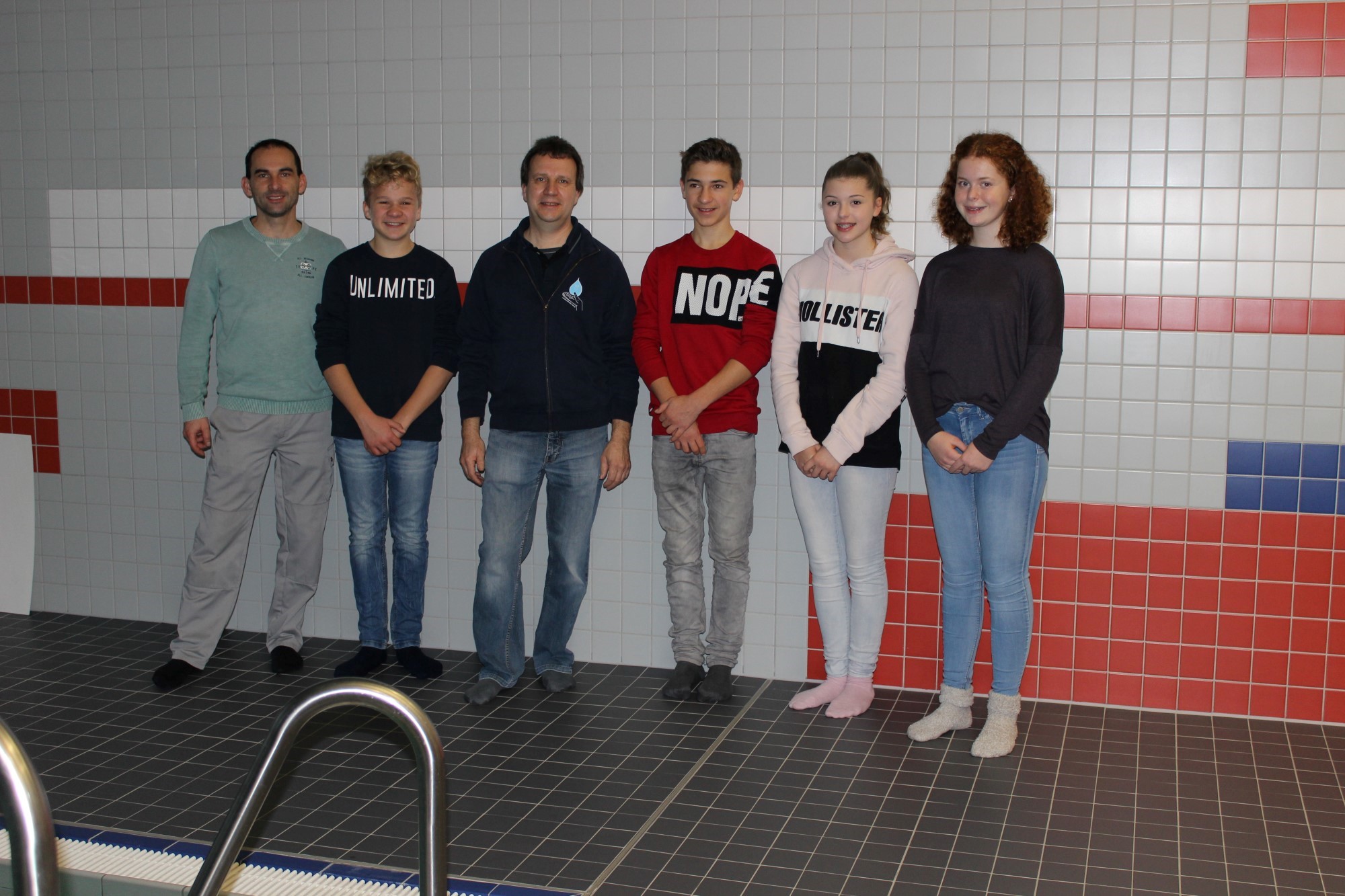 Im Therapiebad, das "Wassertropfen e.V." einst rettete: (von links) WVR-Lehrer Stefan Kowalsky, Felix Huber, Vereinsvorsitzender Ralf Butsch, Klassensprecher Tim Busam und Emily Geiler sowie Nele Sester