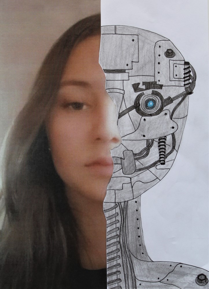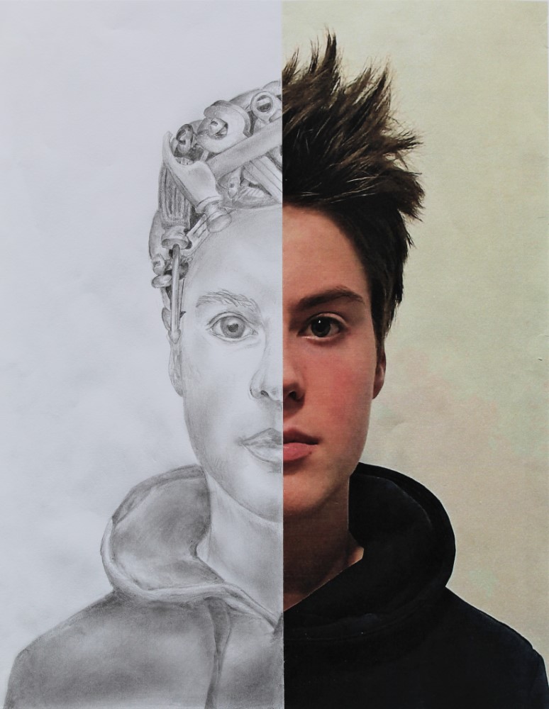 Eine der beiden fotografierten Gesichtshälften wurde abgetrennt und zeichnerisch ersetzt bzw. malerisch ergänzt, Technik und Material waren dabei freigestellt.