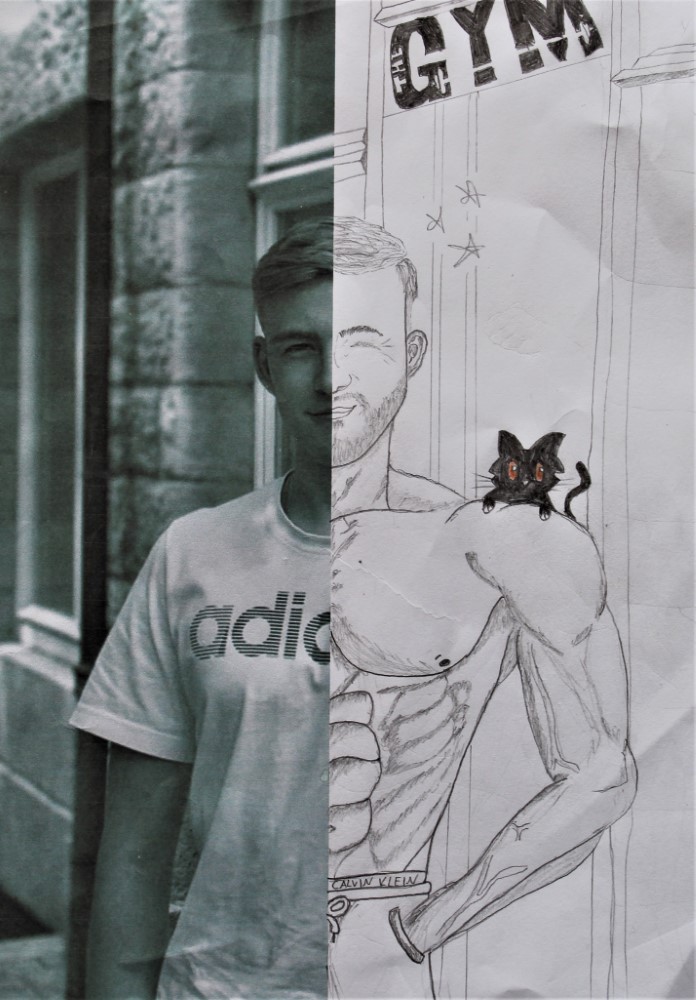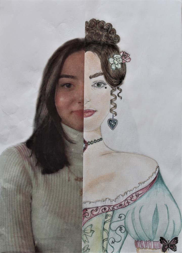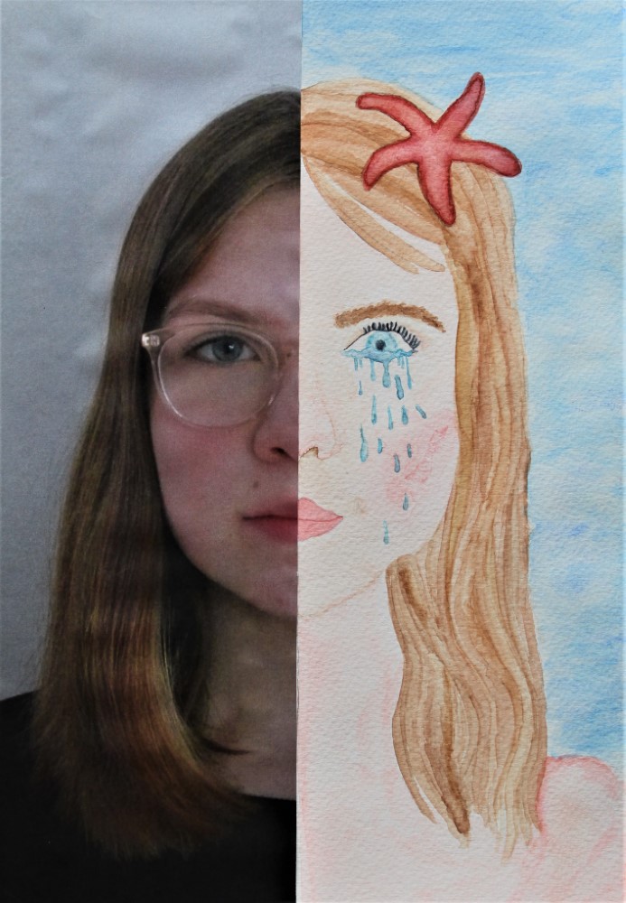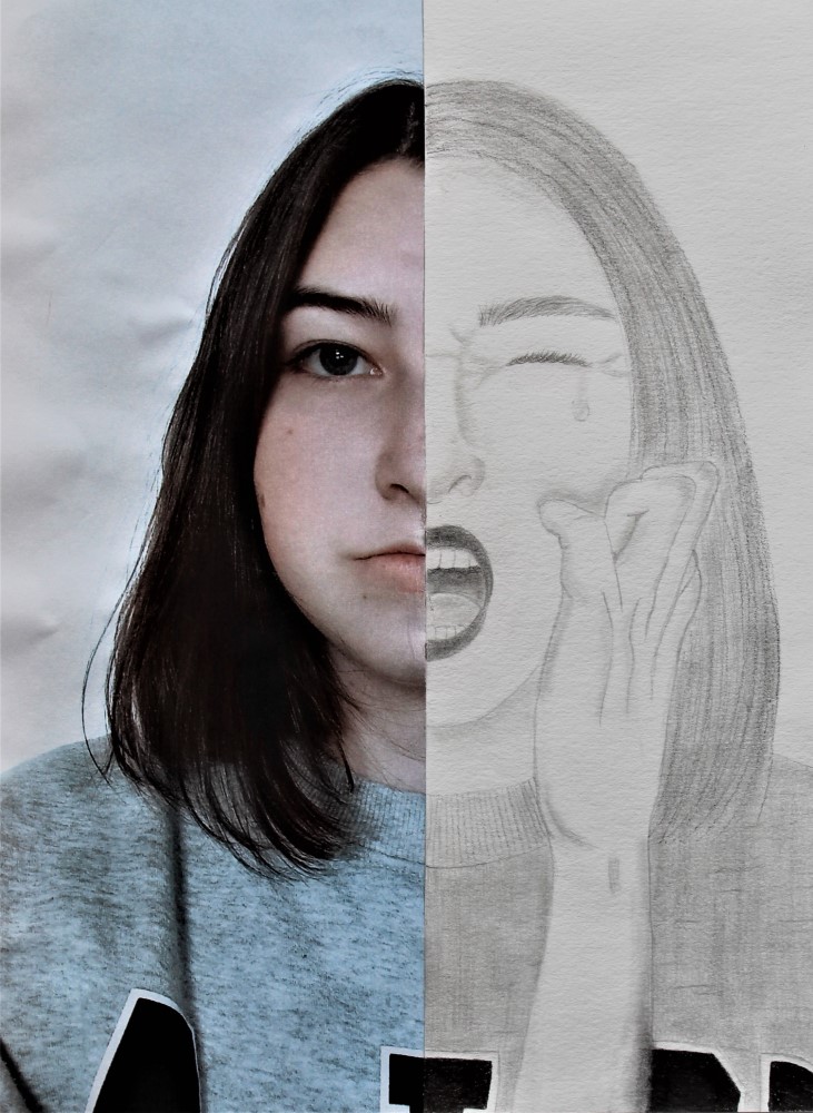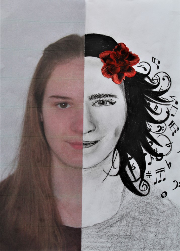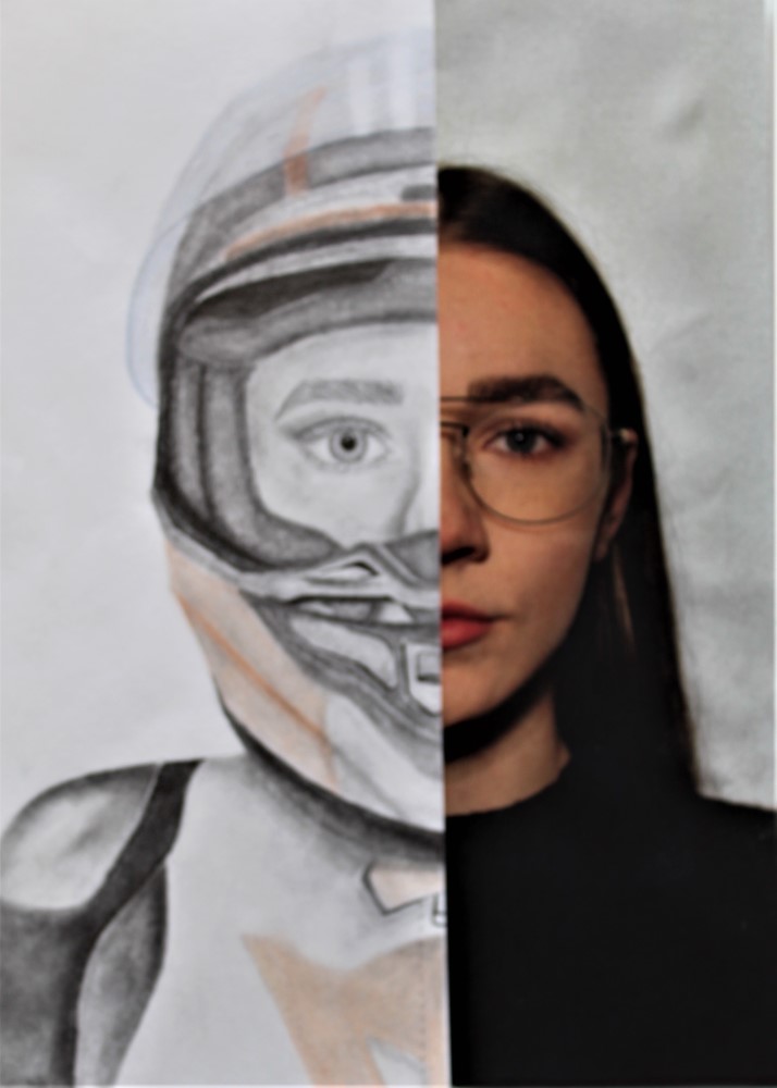 Eine der beiden fotografierten Gesichtshälften wurde abgetrennt und zeichnerisch ersetzt bzw. malerisch ergänzt, Technik und Material waren dabei freigestellt.