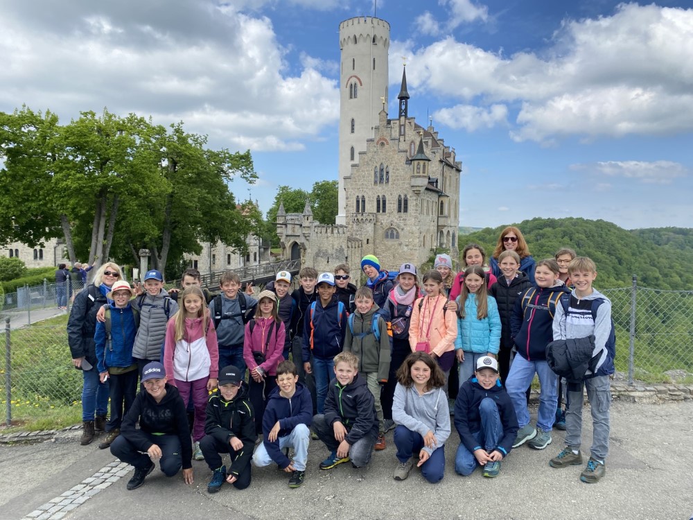 Die Klasse 5b mit Klassenlehrerin Simone Seiler vor dem Schloss Lichtenstein