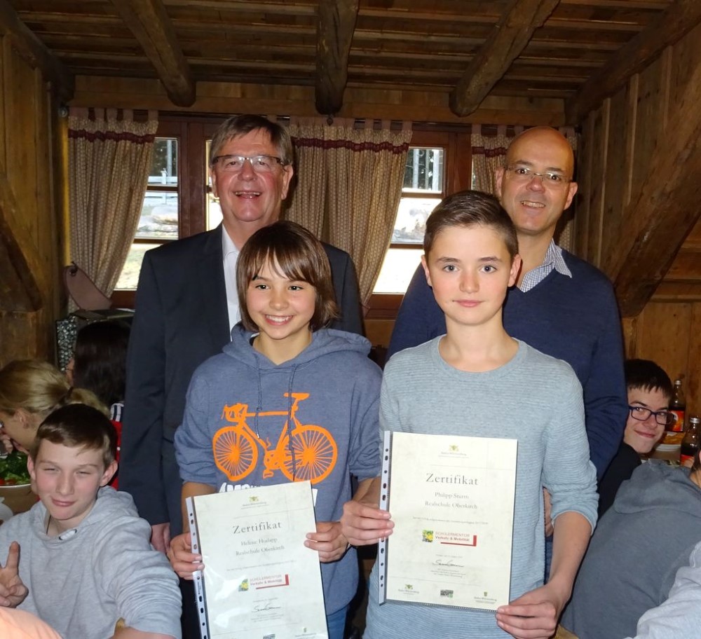 Zwei neue Schülermentoren „Rad fahren“ erhielten ihre Ernennungsurkunden direkt aus den Händen des Landtagsabgeordneten Willi Stächele überreicht.