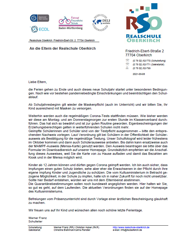 Hier finden Sie den Elternbrief zum Schuljahresstart 2021, einen weiteren Elternbrief zu Coronaregelungen, einen Brief des Ministeriums, den Stundenplan am ersten Schultag, den Anmeldungslink zum Mensa-Ausweis "MAMPF", der gleichzeitig als Schülerausweis fungiert sowie Information und Anmeldebogen zur Ganztagesbetreuung Kl. 5-7.