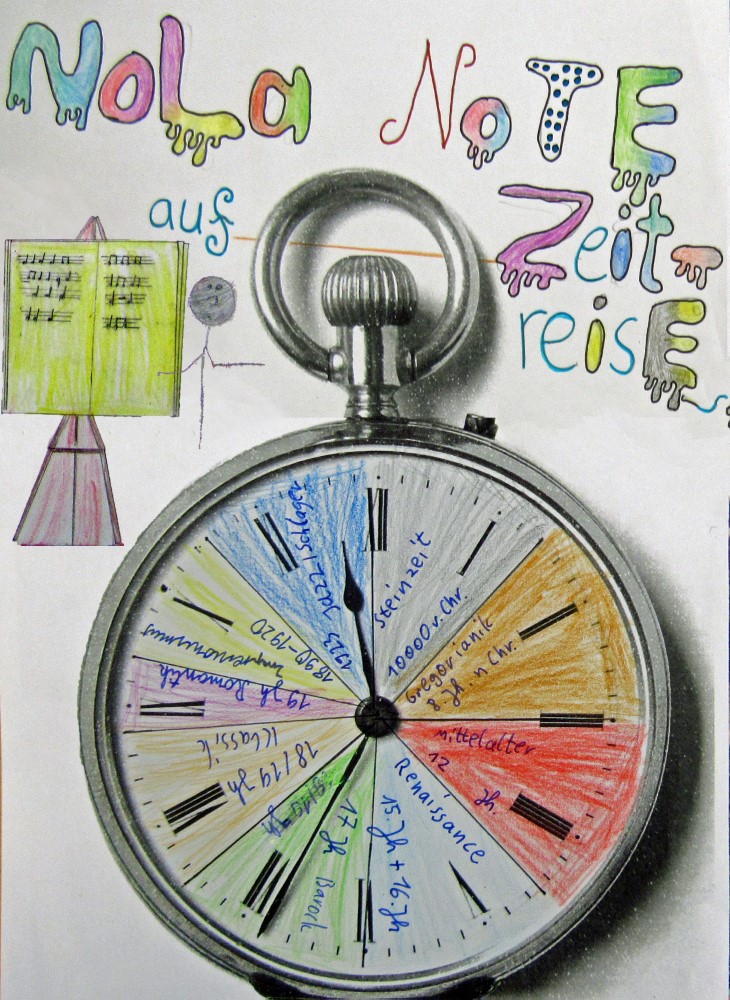 Musik und Bildende Kunst wurden in einem fächerübergreifenden Projekt der Klasse 5d zu einem spannenden Zeitreiseerlebnis, bei dem Bilder aus 9 Musikepochen entstanden.