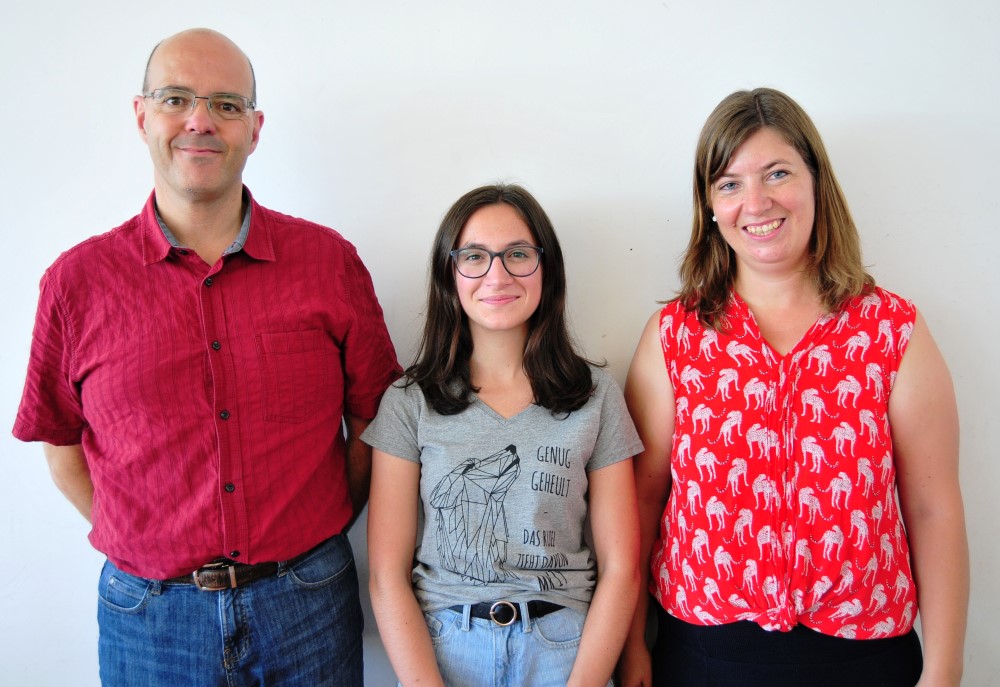 Rektor Werner Franz und Klassenlehrerin Sarah Hohwieler gratulieren Stefanie Panter, die in allen Fächern die Note Eins erhielt.