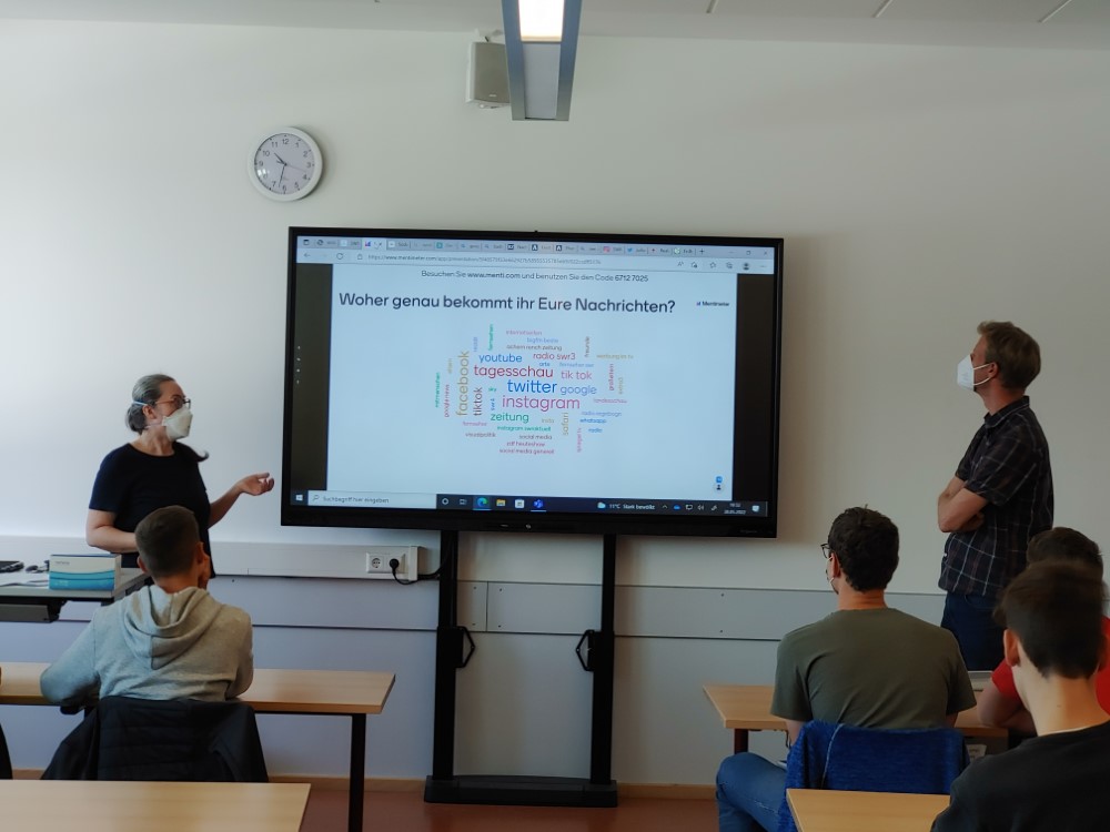 Sandra Tell, Medienpädagogin des Landesmedienzentrums Freiburg, und Herr Jan Lehmann, Landesschau-Reporter des SWR, leiteten den Workshop. Jan Lehmanns Beispiele aus dem Alltag eines Reporters ließen die 9. Klässler in die Welt des Fernsehens eintauchen. Abschließend durften die Schüler selbst eine „Fake“- Nachricht verfassen, die natürlich gleich auf ihre „Echtheit“ von der Klasse überprüft wurde.