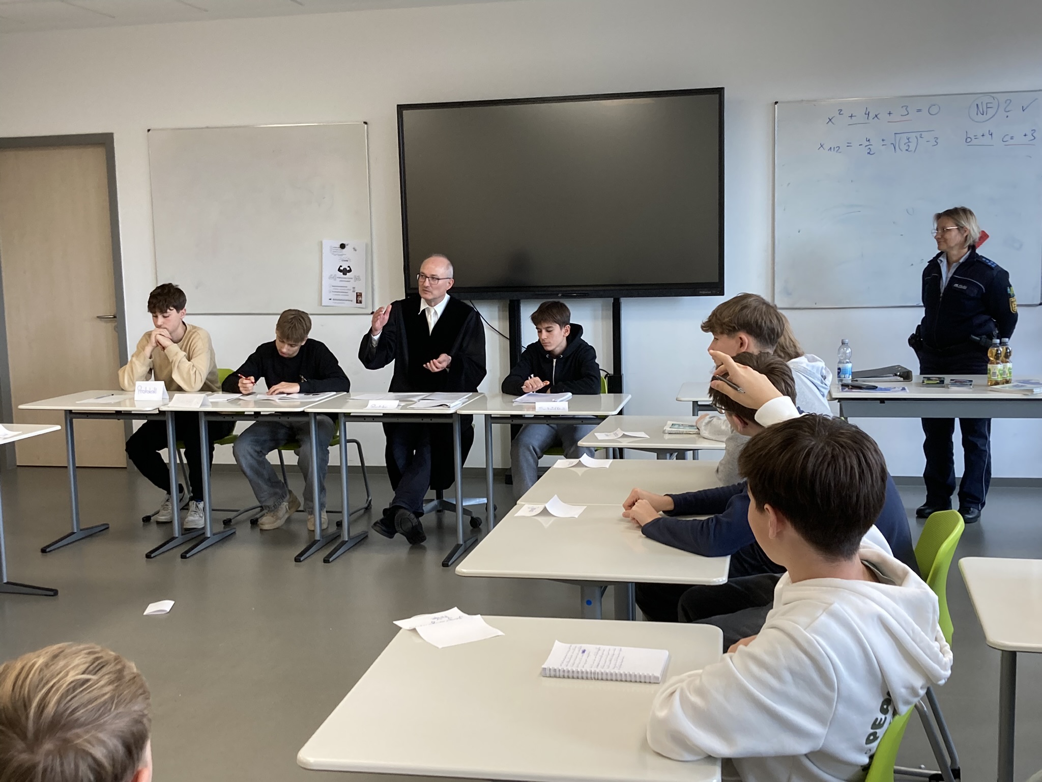 Den Höhepunkt des Projekttages bildete die nachgestellte Gerichtsverhandlung, bei der die Schülerinnen und Schüler in die Rollen der Zeugen, der Täter, der Verteidiger, der Staatsanwaltschaft und des Geschädigten schlüpfen durften. Mit viel Engagement verkörperten sie die einzelnen am Prozess beteiligten Personen, sodass am Ende ein Urteil gesprochen werden konnte.