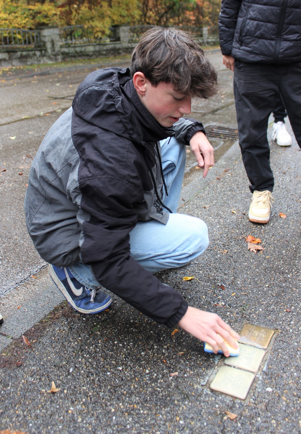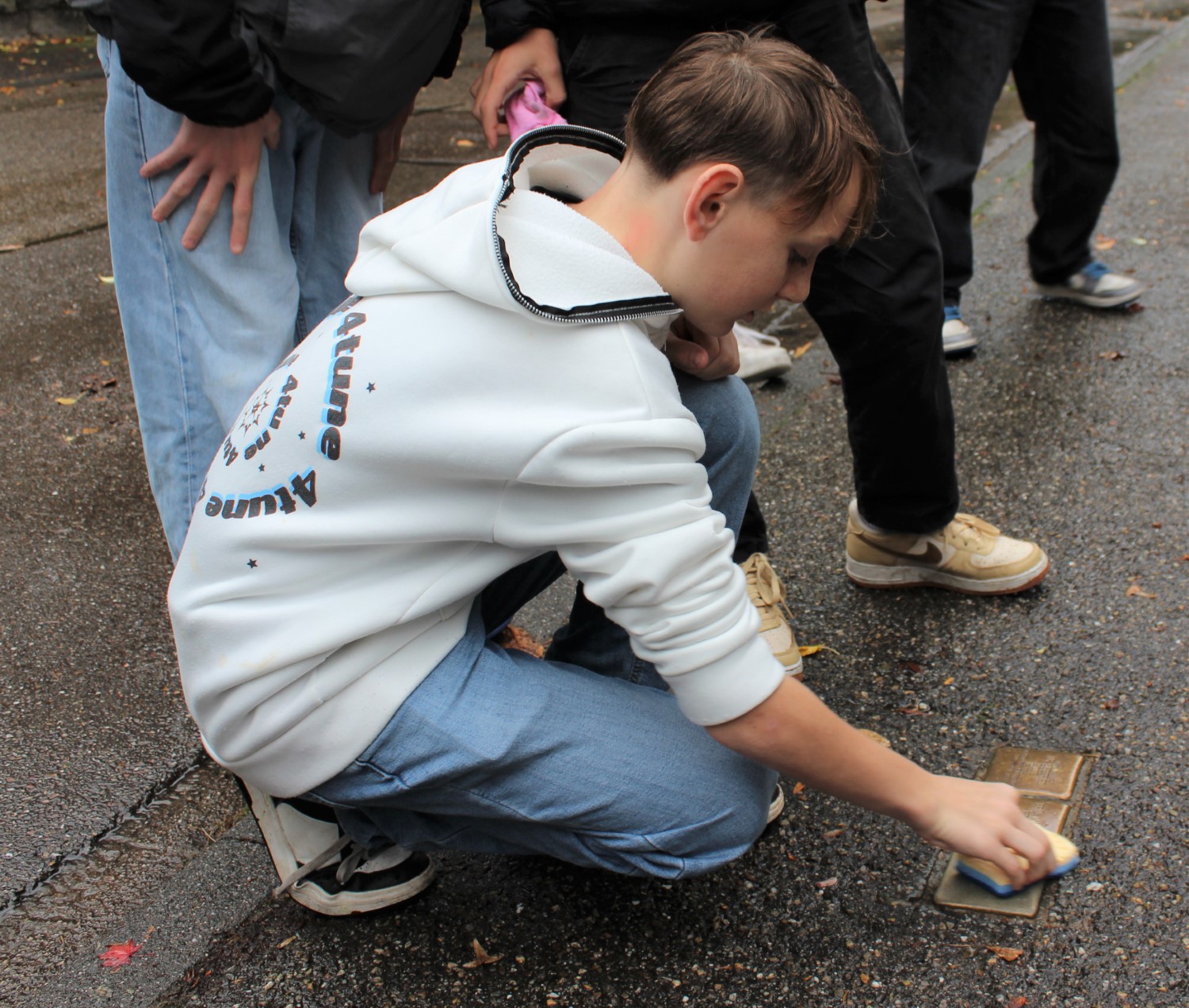 Anlässlich des Jahrestags der Reichspogromnacht reinigen Neuntklässler die Stolpersteine der Oberkircher Familie Boss