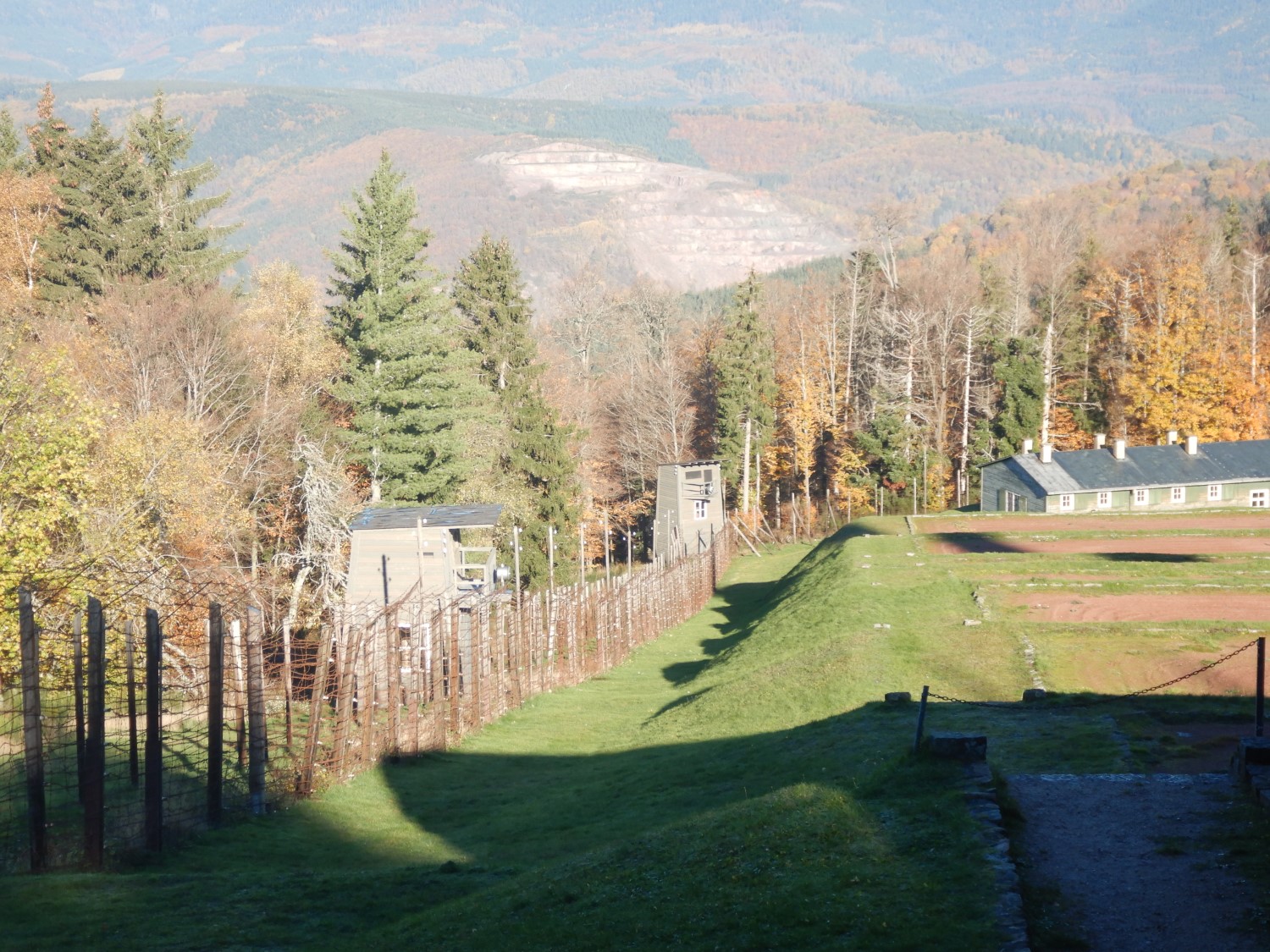 Befestigungsanlage mit Stacheldrahtzaun und Wachtürmen. Im Hintergrund der Granitsteinbruch,