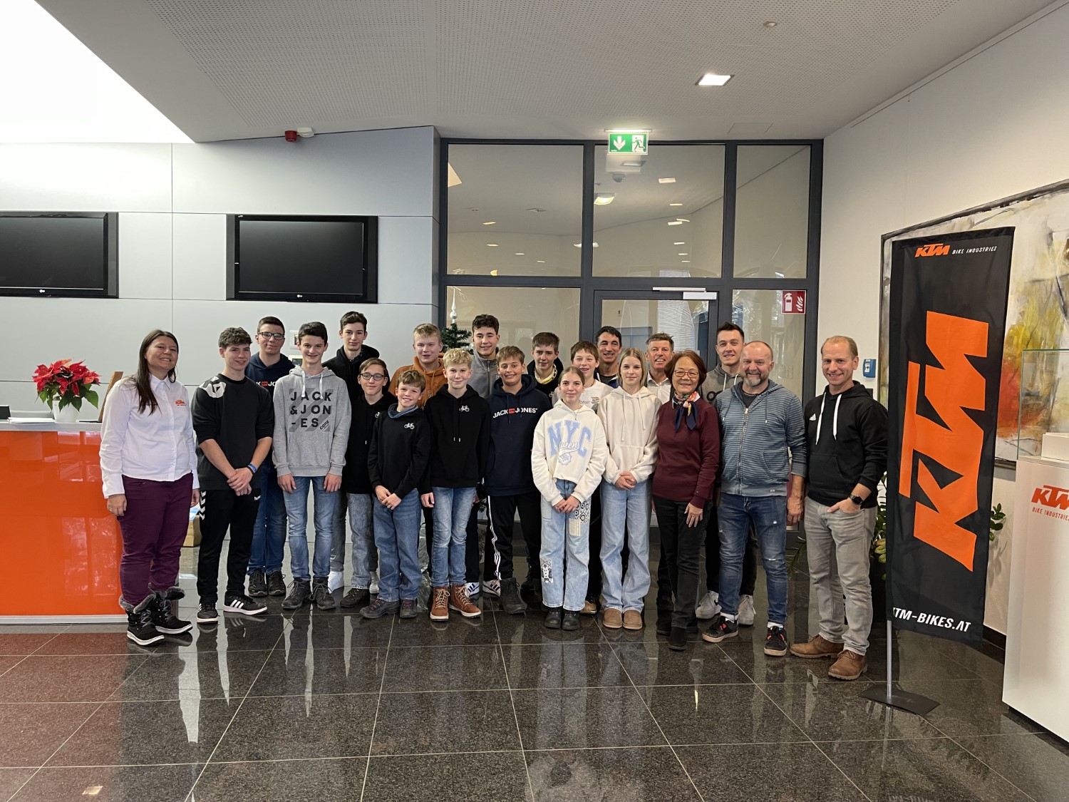 Am nächsten Morgen ging es für die Teilnehmer nach dem Frühstück Richtung Mattighofen. Dort angekommen, wurde zuerst die Siegerehrung der Stadtrallye von Cornelia Urkauf durchgeführt. Die Gewinnergruppe erhielt einen Americano Thermobecher von KTM und alle Teilnehmer durften sich über einen Sportbeutel mit Firmenaufdruck freuen. Im Anschluss daran begrüßte der Geschäftsführer Stefan Limbrunner die Realschule Oberkirch im Stammwerk Mattighofen. Er freute sich über die mehrfache Auszeichnung als fahrradfreundlichste Schule Deutschlands und den TV-Beitrag von SWR Aktuell. Wir alle können einen Beitrag zur Mobilitätswende und zum klimafreundlichen Umgang mit unserer Zukunft durch das Fahrradfahren leisten, so Limbrunner. Wir würden hierzu einen großen Teil dazu beitragen, da bei uns an der Schule jeder mit dem Fahrradfahren vertraut gemacht würde.