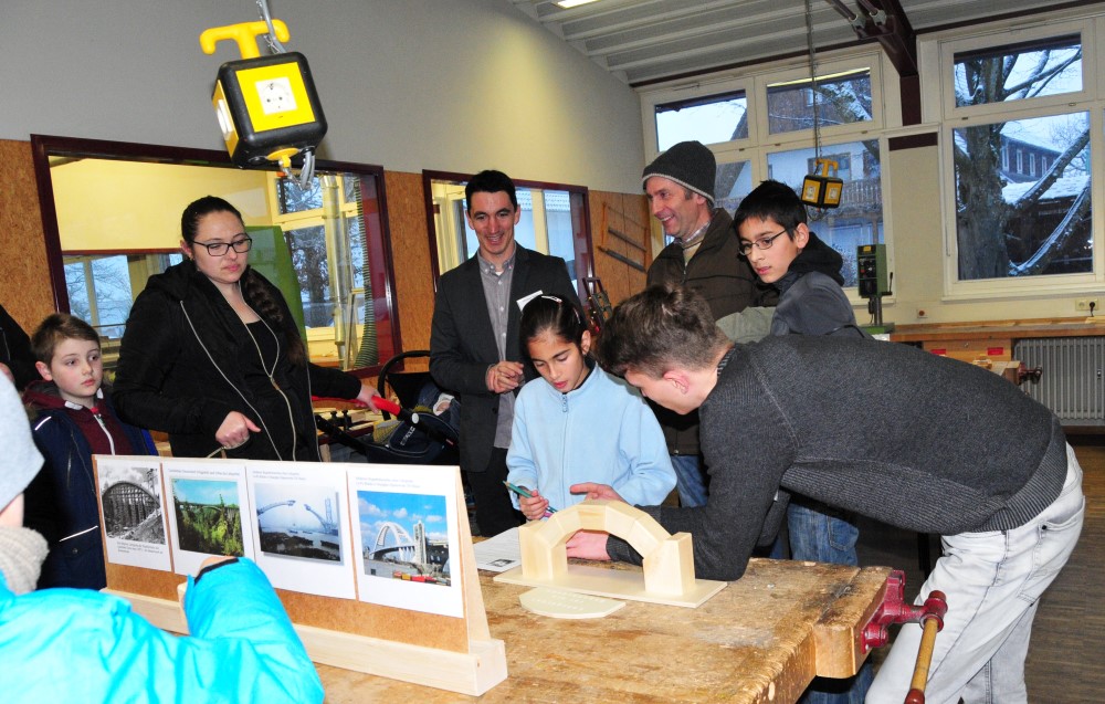 Interessant vor allem da, wo die jungen Besucher beobachten, experimentieren und selbst bauen dürfen, hier zusammen mit Konrektor Christian Huber (3. von links).
