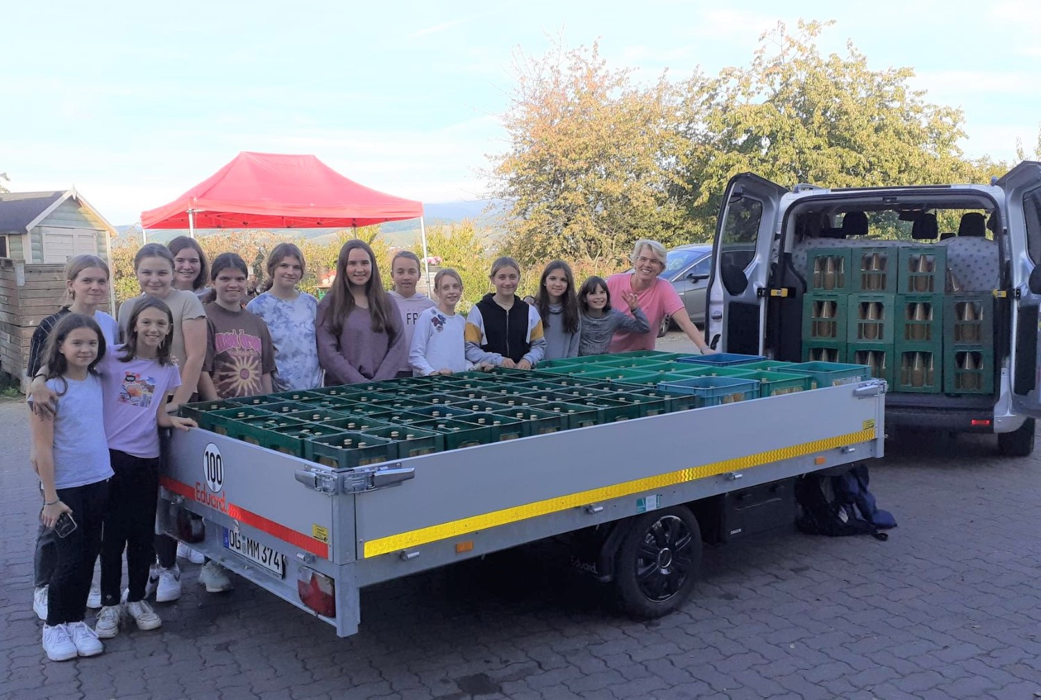 An dieser Stelle noch einmal ein recht herzliches Dankeschön an Nicola Bruders Opa, der die Umwelt-AG seine Apfelbäume abernten ließ und an Annica Müllers Papa, ohne dessen „Fuhrpark“ und Mithilfe die Aktion nicht so einfach möglich gewesen wäre.