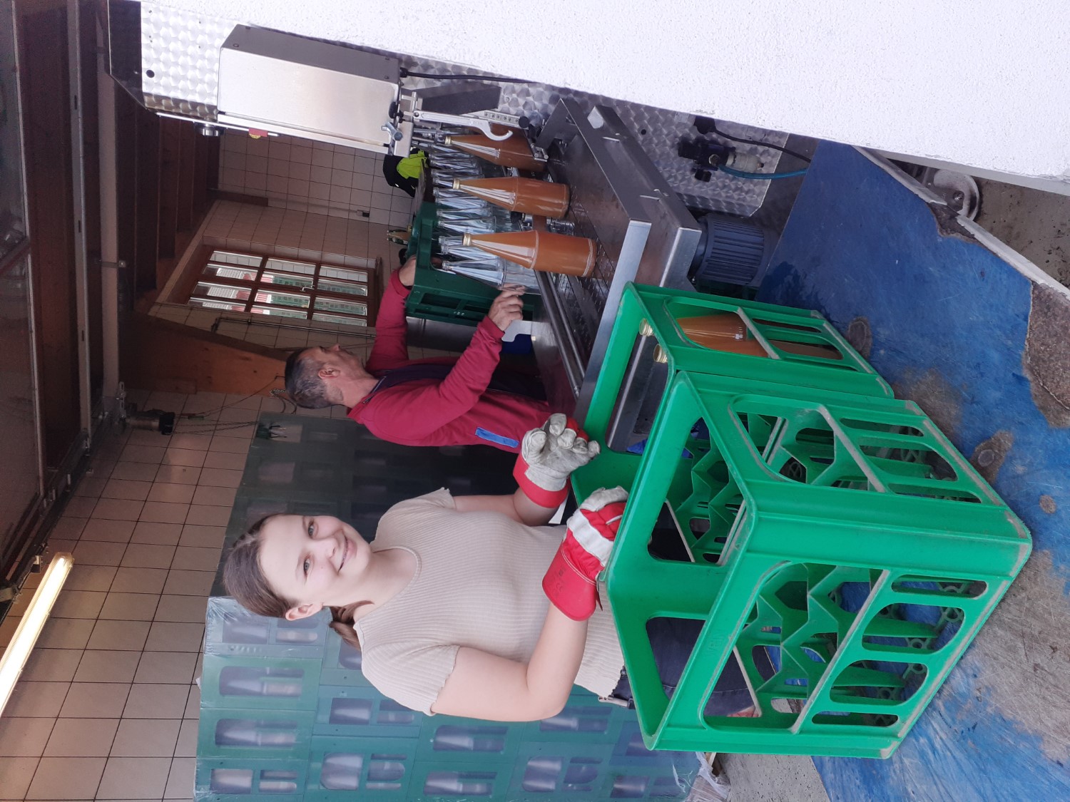 Es blieb kaum Zeit für eine Pause, denn schon kurz danach hatte man einen Termin beim Obsthof Kasper in Nussbach, um die Äpfel pressen zu lassen und zu schmackhaftem Apfelsaft zu trotten. Um den Saft haltbar zu machen, wird er erhitzt und dann sofort in Flaschen abgefüllt. Sage und schreibe 613 Flaschen Saft waren das Ergebnis dieses Arbeitseinsatzes.