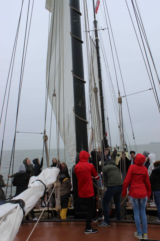Der nächste Tag bestand aus: Segelschiff aufräumen, der Einweisung zum korrekten Segeln aufmerksam folgen, Segel hissen, zwei Schleusen auf dem Weg durchqueren, sich unterhalten, Spiele spielen, einfach mal an Deck die Umgebung auf See zu genießen sowie seekrank zu werden. Am Abend legten wir in Den Hoover an.