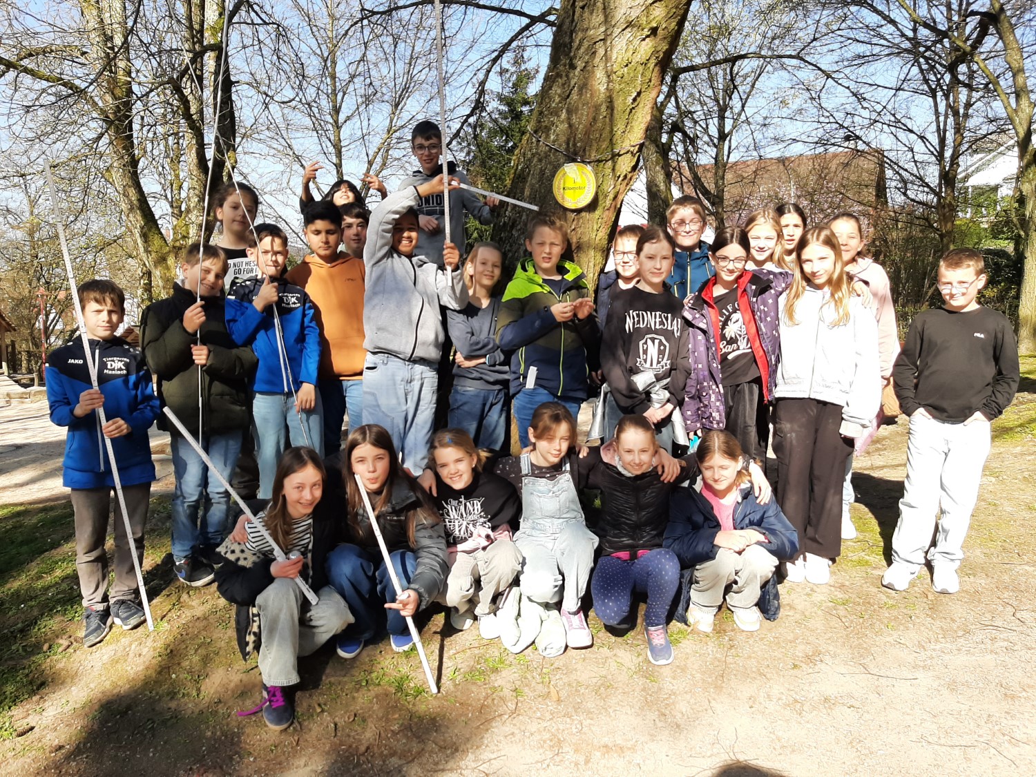 Die Klasse 5e hat sich zusammen mit ihrer Mathematiklehrerin Dr. Barbara Schmidt auf die spannende Suche nach dem 1000-Meter-Baum gemacht. Mit eigens entwickelten Messmethoden haben sich die Schüler*innen nach einem gescheiterten, jedoch lehrreichen Versuch erneut auf den Weg gemacht und einen Baum gesucht, der genau 1km von der Schule entfernt ist. Dieses Mal mit Erfolg! Im Stadtgarten trafen sie auf eine Eiche, die sie als 1000-Meter-Baum küren konnten.