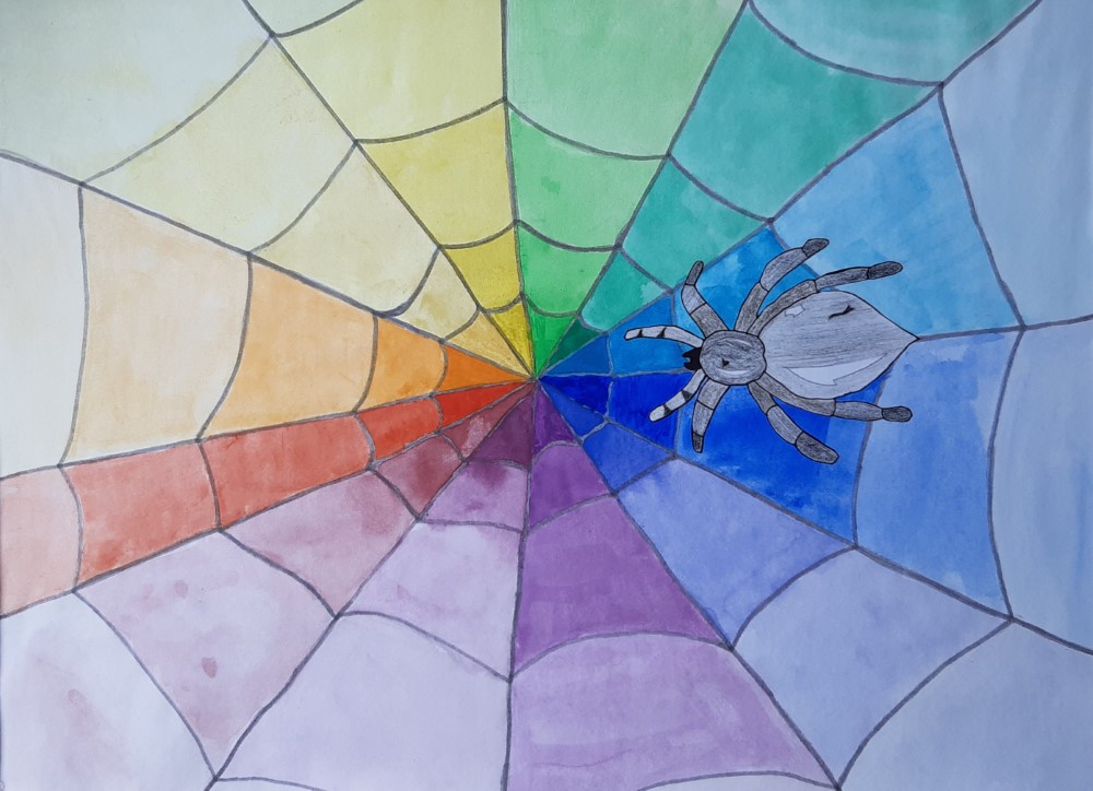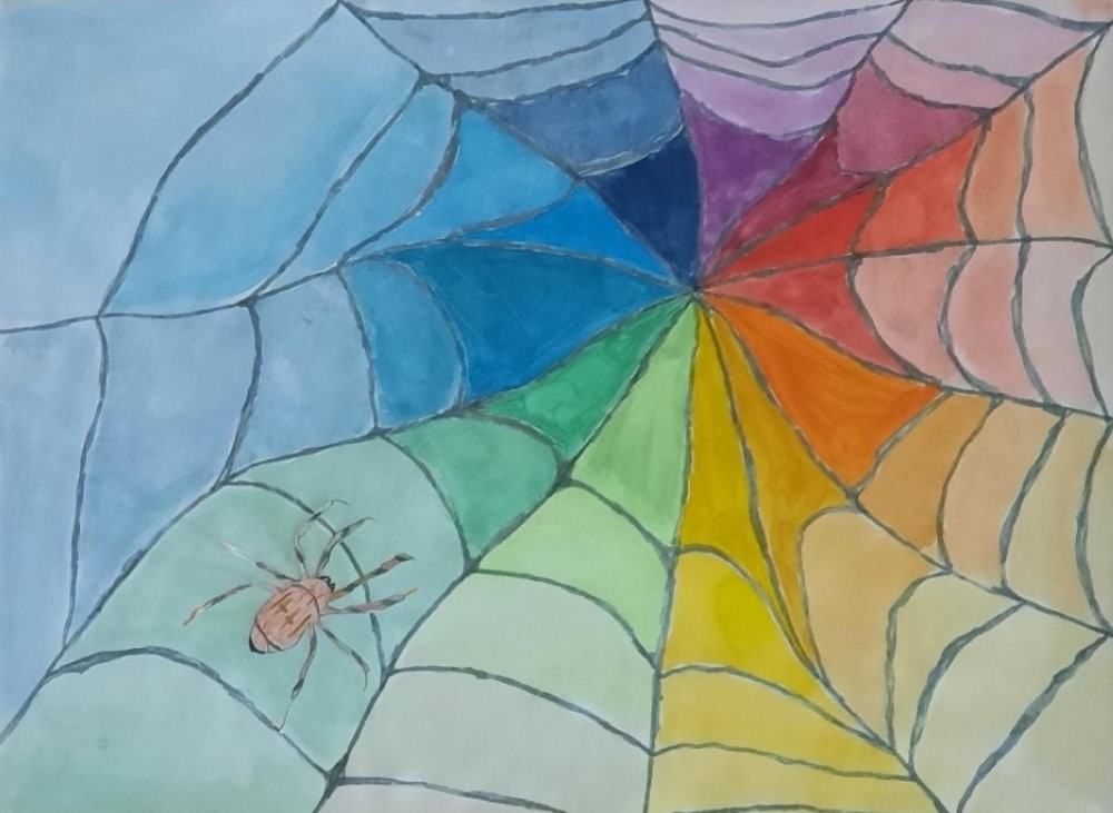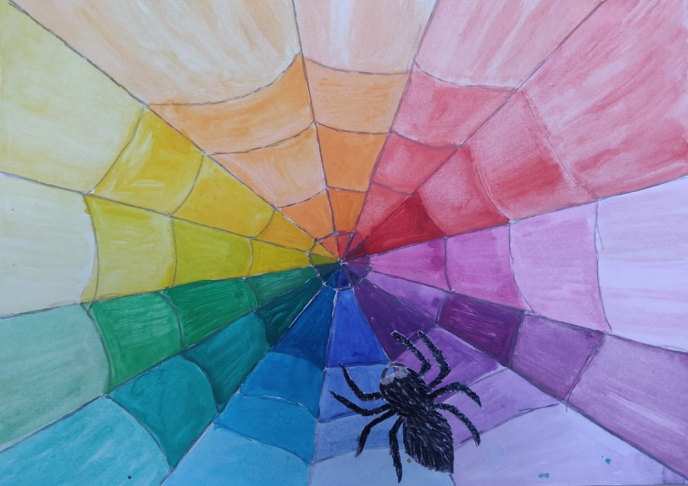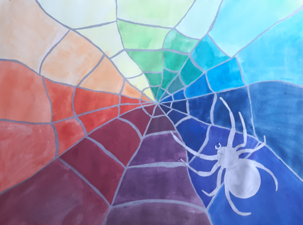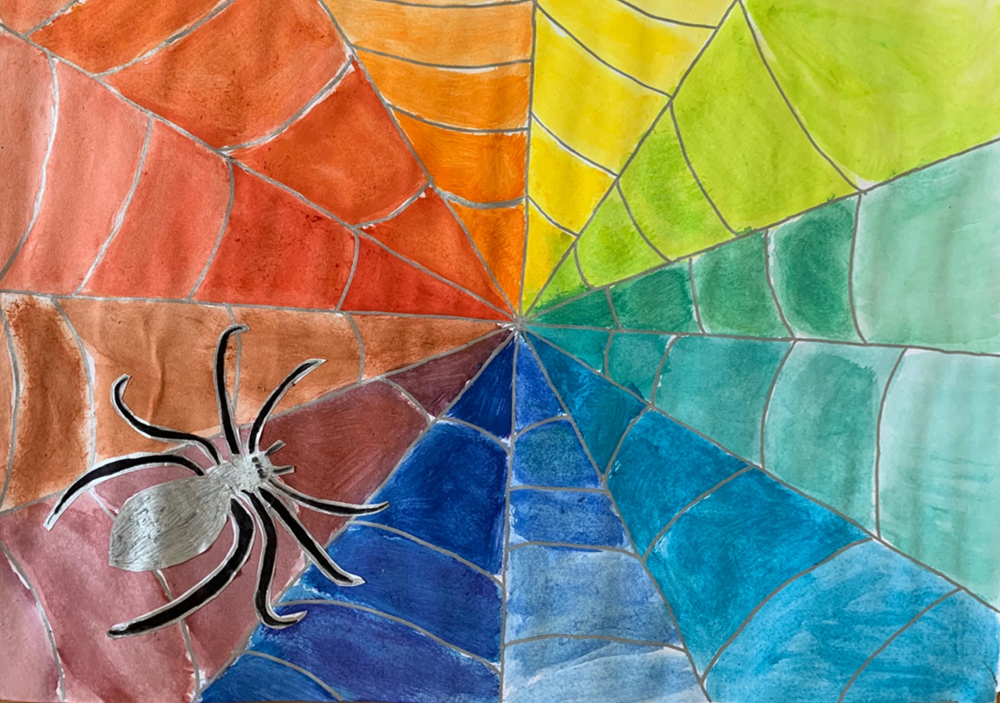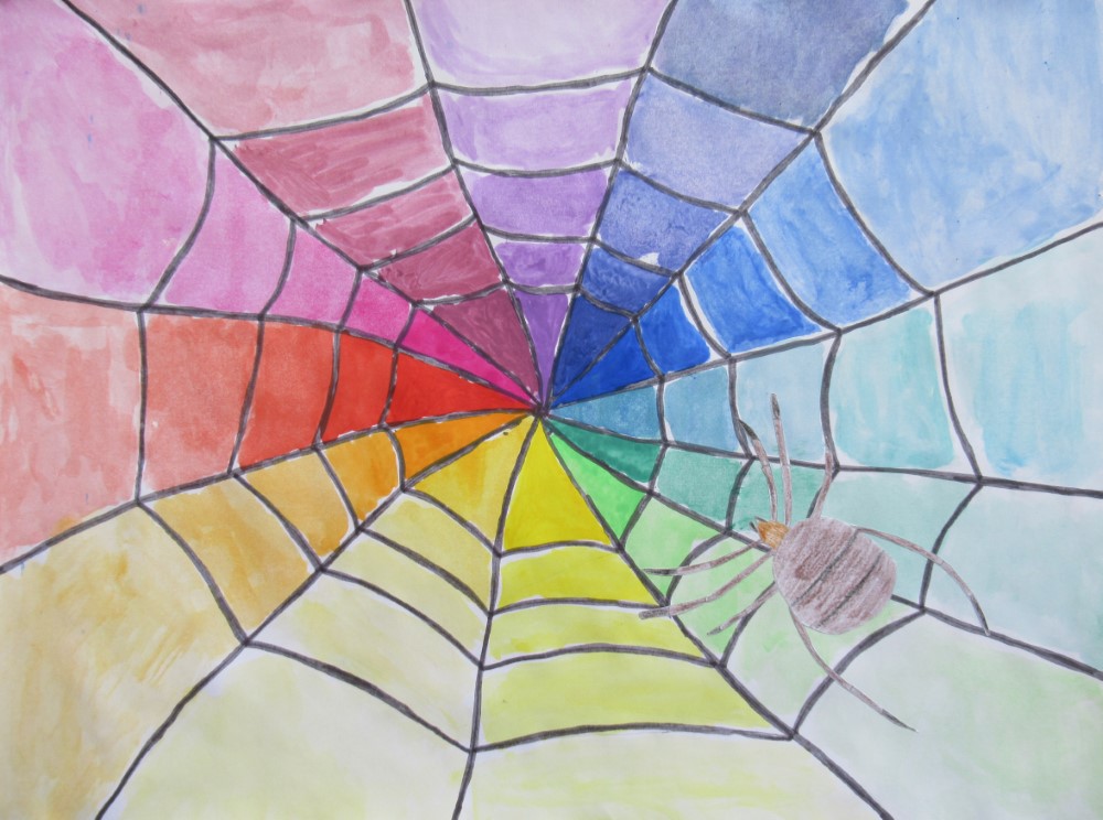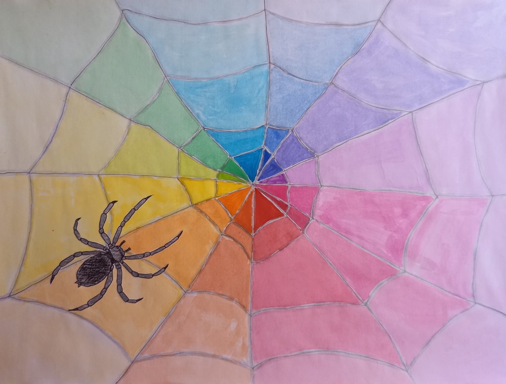Die Schüler und Schülerinnen setzten den Farbkreis in Form eines Spinnennetzes um. Die Spinne wurde separat gezeichnet und anschließend auf das Netz geklebt.