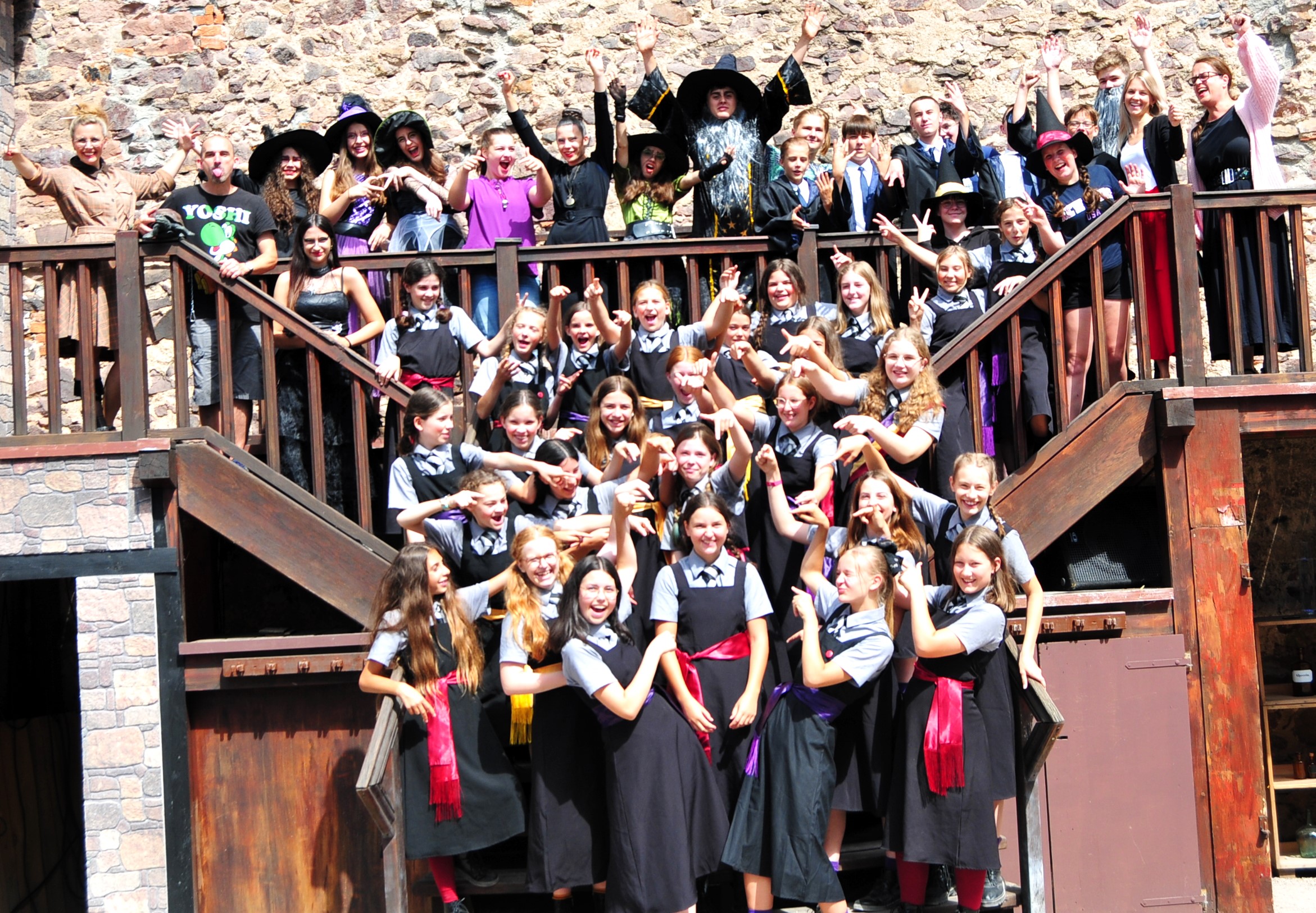 Eine tolle 60-köpfige Schauspieltruppe, die das ganze Stück präsent war, großartige Einzeldarsteller, wie Evita Brandstetter, die die „lausige Hexe“ ideal verkörperte, ihre Antagonistin Larissa Rindler als Esther Edel, ergänzt durch die Lehrerinnen Frau Graustein/ Frau Granit (Maria Guerra in toller gegensätzlicher Doppelrolle), Ko-Autorin Anne Kowalsky (sehr reif als Frau Harschmann) oder die exaltierte Frau Maus (Frauke Baldus-Fleck). Ausgefeiltes Bühnenbild, aufwendige Technik – zentral bei den Zaubereien, stilechte Kostüme (Katrin Merkel), ein harmonisches Team, dessen Spielfreude ansteckend war.