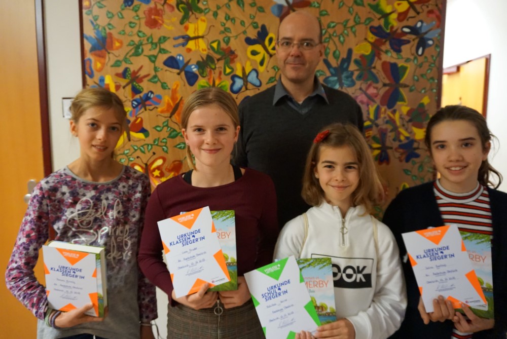 Schulleiter Herr Franz mit den Siegerinnen Tamara Kimmig, Lana Bähr, Felicitas Serrer (Schulsiegerin) und Selina Bentrup (von links nach rechts).