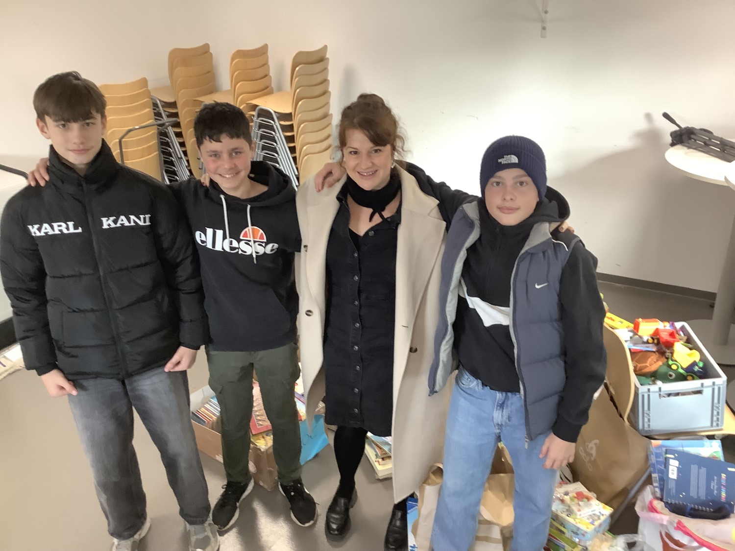 Lehrerin Christiane Graab mit Schülern aus der Klasse 8d beim Sortieren der Sachspenden